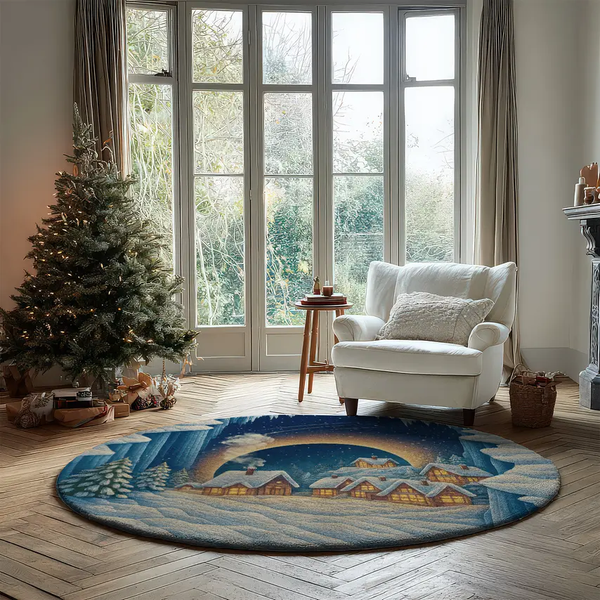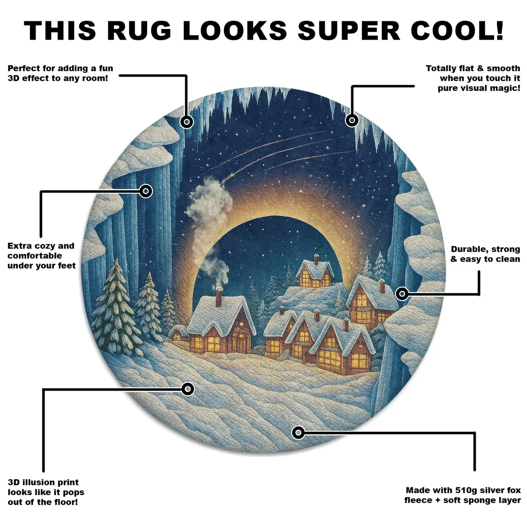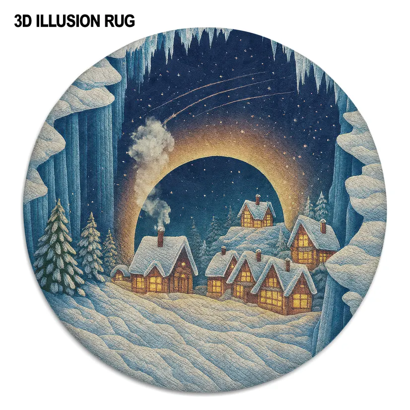 The Blue Beige 3D Illusion Rug Captivating Winter Wonderland Design transforms any space with its enchanting winter scene, blending serene blues and warm beige tones. This round rug features a cozy village nestled in snow under a starry sky, creating a magical and inviting atmosphere for your home.