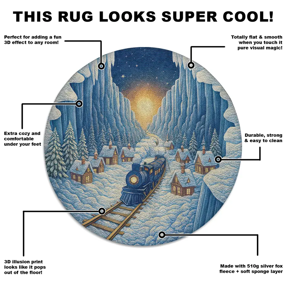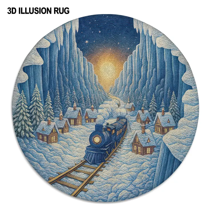 The Blue White 3D Illusion Train Rug For Unique Home Decor presents a captivating winter scene where a charming blue train winds through a snow-covered village nestled between towering icy cliffs. This round rug blends cool blue and white hues to create a serene, enchanting atmosphere that transforms any living space with artistic flair.