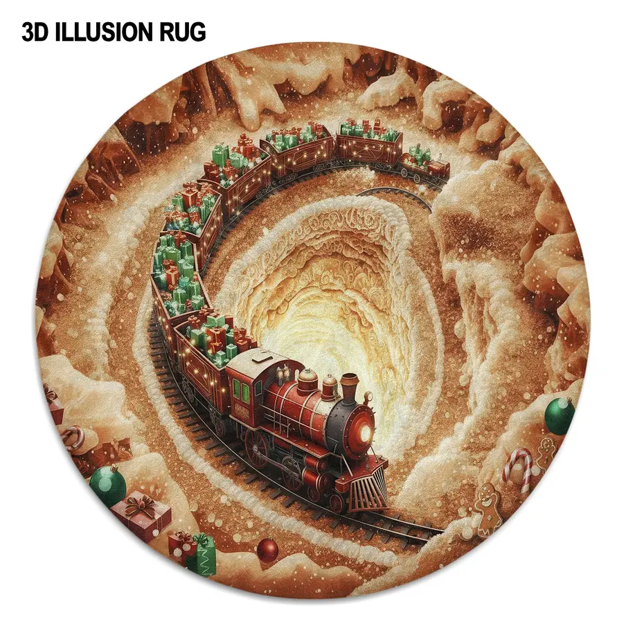 The Brown Red 3D Train Illusion Rug Perfect For Christmas Decor brings a magical and festive vibe to any room. Featuring a captivating circular design, this rug showcases a vintage red train loaded with colorful gifts, winding through snowy, gingerbread-inspired landscapes, making it ideal for holiday celebrations.