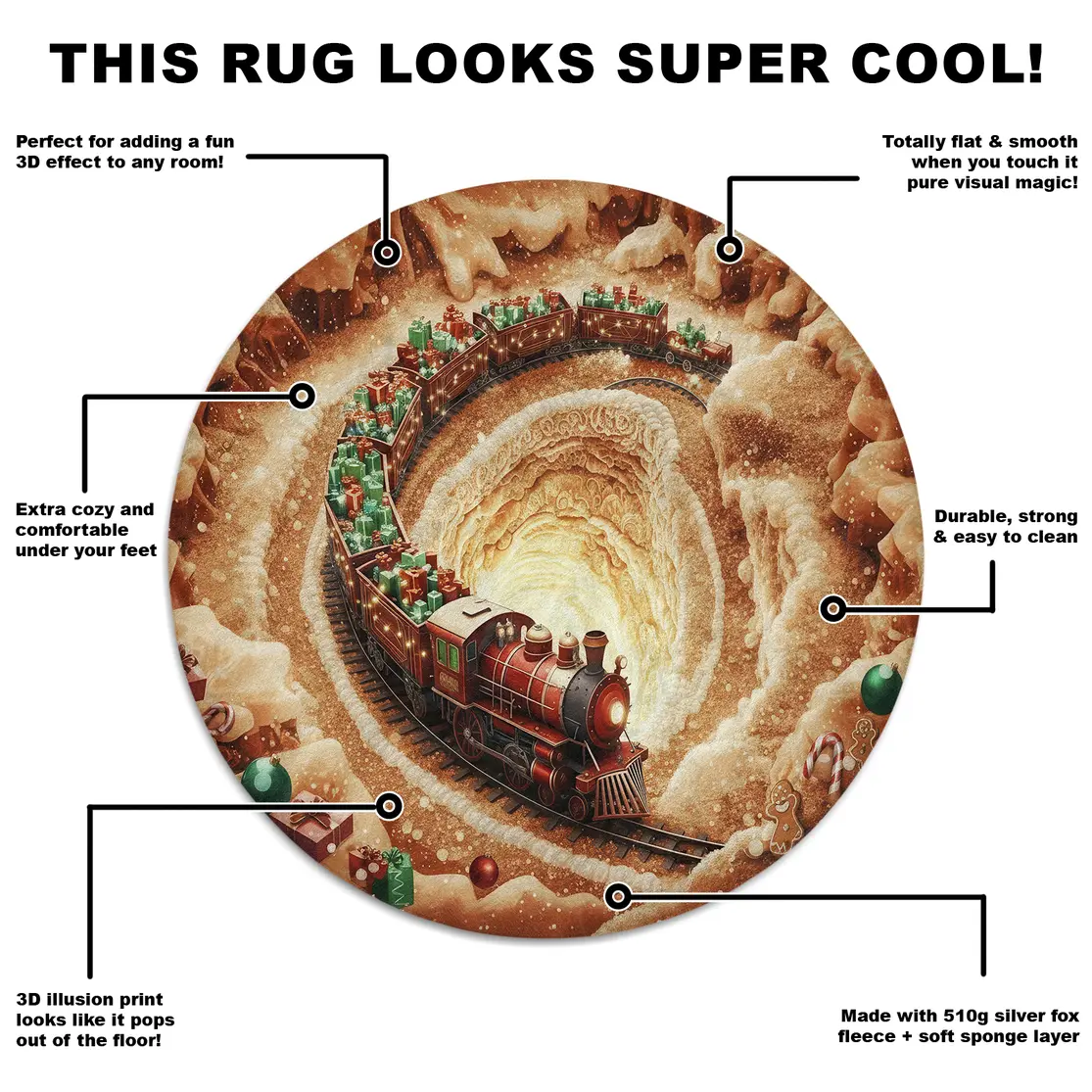 - Immersive 3D Design: The rug’s distinctive 3D illusion effect creates depth and movement, making the train appear as if it is traveling through the snow-filled scene, which enhances your Christmas decor with a dynamic visual appeal.