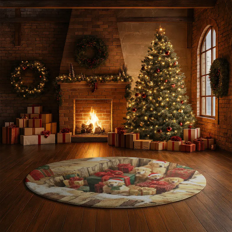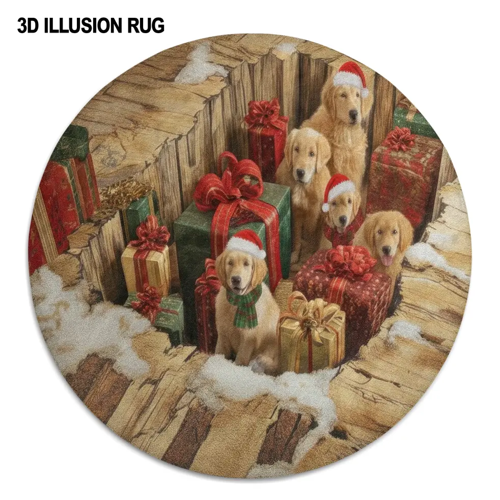 The Brown Red Holiday Illusion Rug 3D Decor With Puppies & Gifts combines festive charm with playful design, featuring a vibrant holiday scene of adorable puppies surrounded by beautifully wrapped gifts. This round rug captures the warmth and joy of the season, making it an eye-catching addition to any holiday decor.