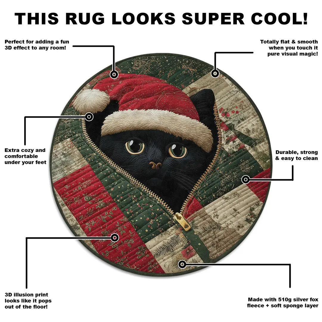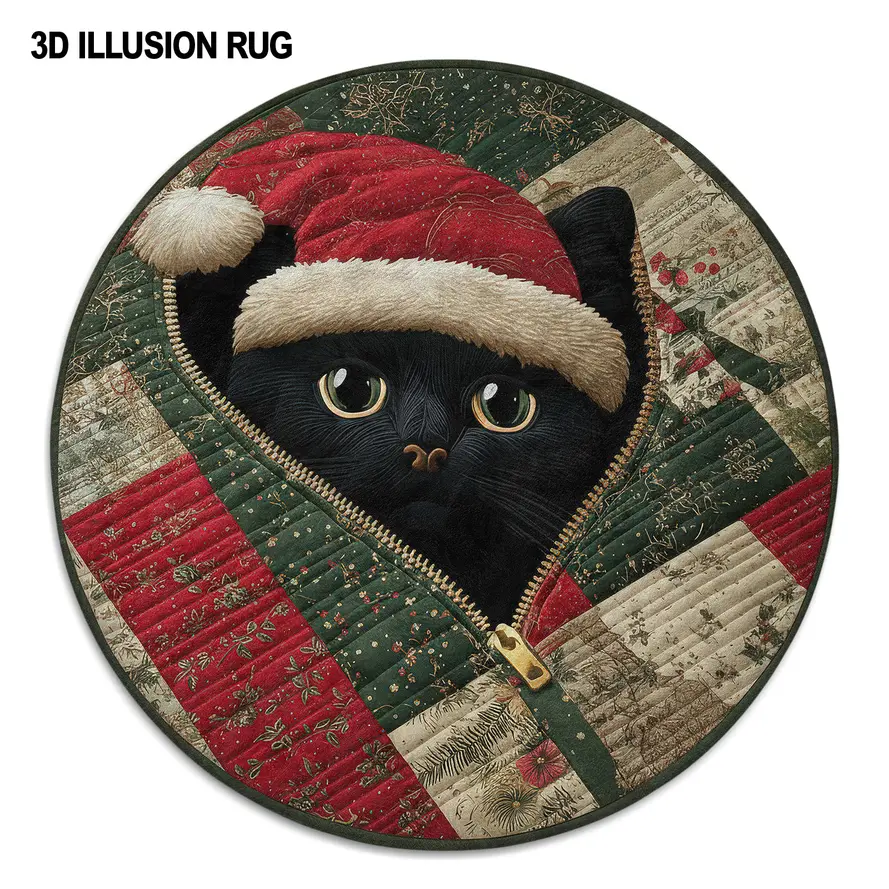 The Green Red 3D Cat Illusion Rug Cozy Holiday Decoration features a charming black cat wearing a festive Santa hat, peeking out from an intricately patterned quilt. This round holiday rug combines traditional Christmas colors and a playful 3D effect, adding a warm and whimsical touch to any seasonal décor.