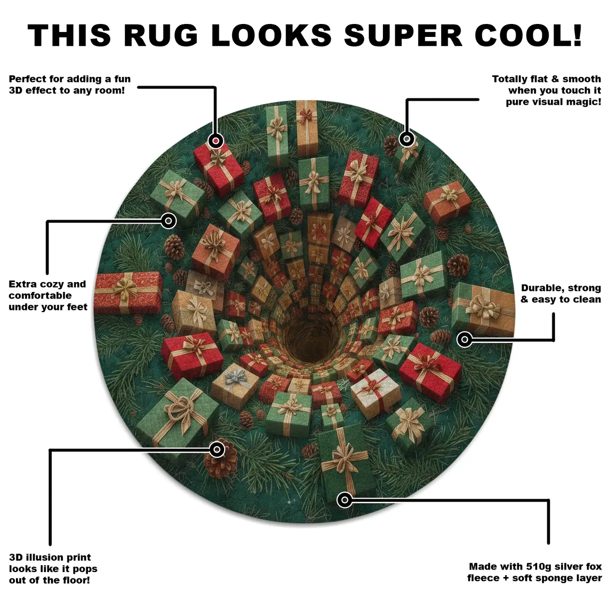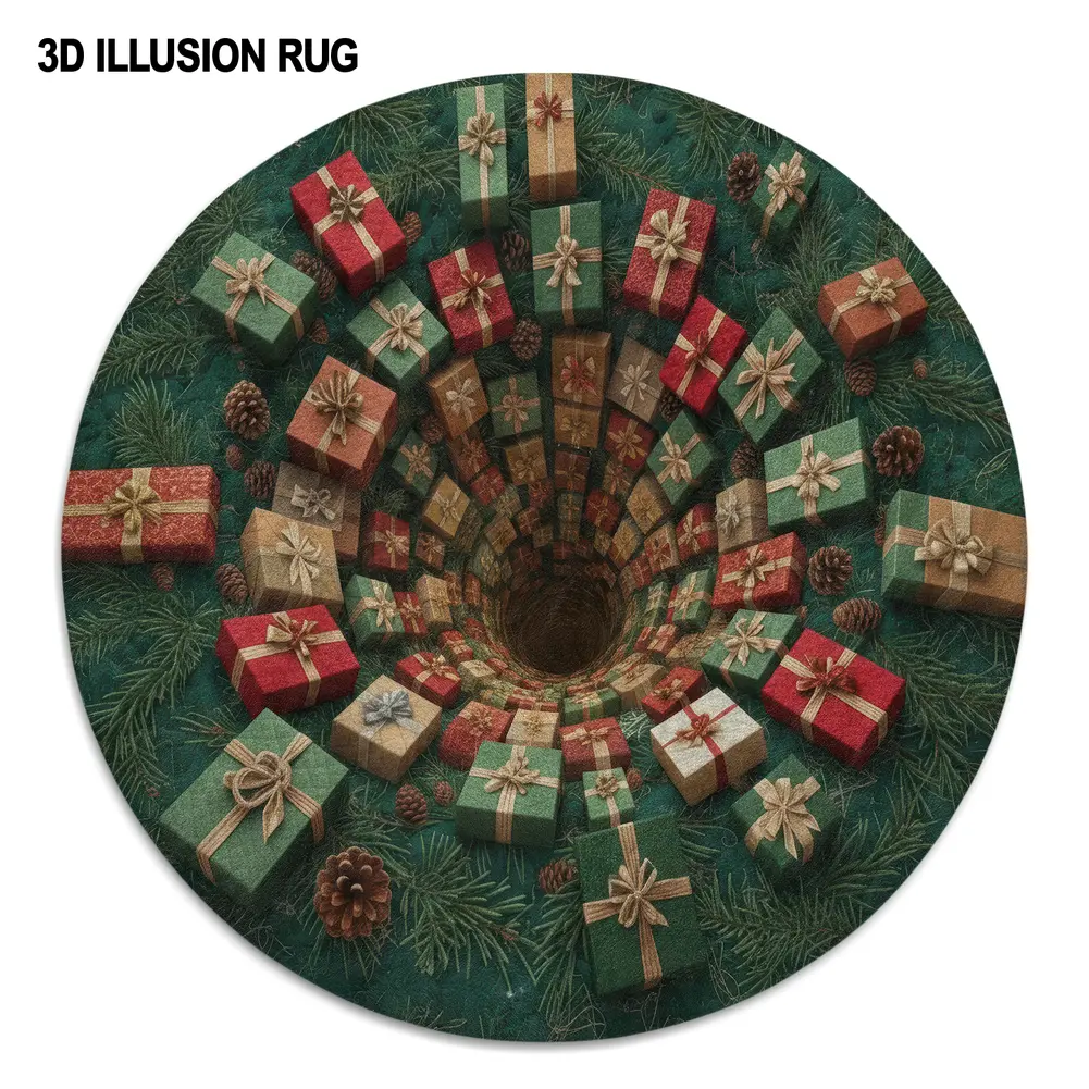 - Intricate 3D Illusion Pattern: The hypnotic spiral of presents creates a sense of depth, making the rug not just a floor covering but a captivating centerpiece. It draws attention and adds a dynamic visual element that transforms any room’s décor.