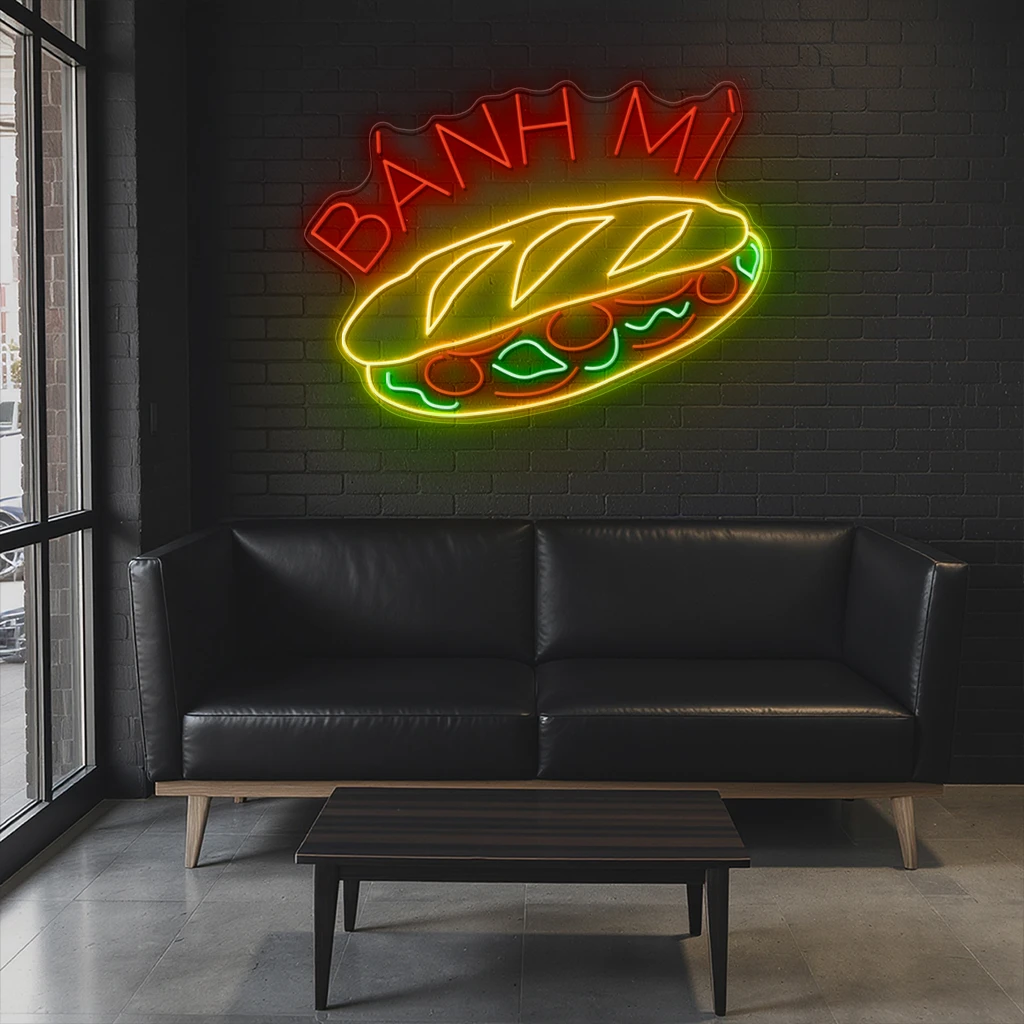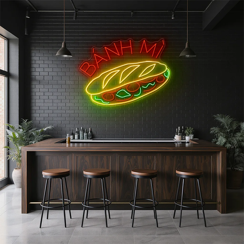- Striking Color Coordination: The neon sign showcases a harmonious blend of red, yellow, and green lights that accentuate the iconic banh mi sandwich. The bright red “BANH MI” lettering draws attention immediately, while the yellow outlines mimic the crisp bread, and green hues represent fresh vegetables, creating a realistic and appetizing visual effect.