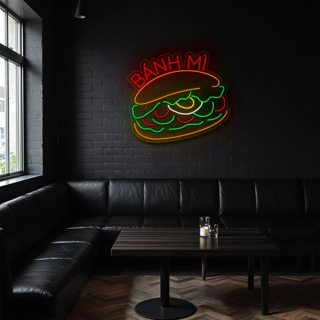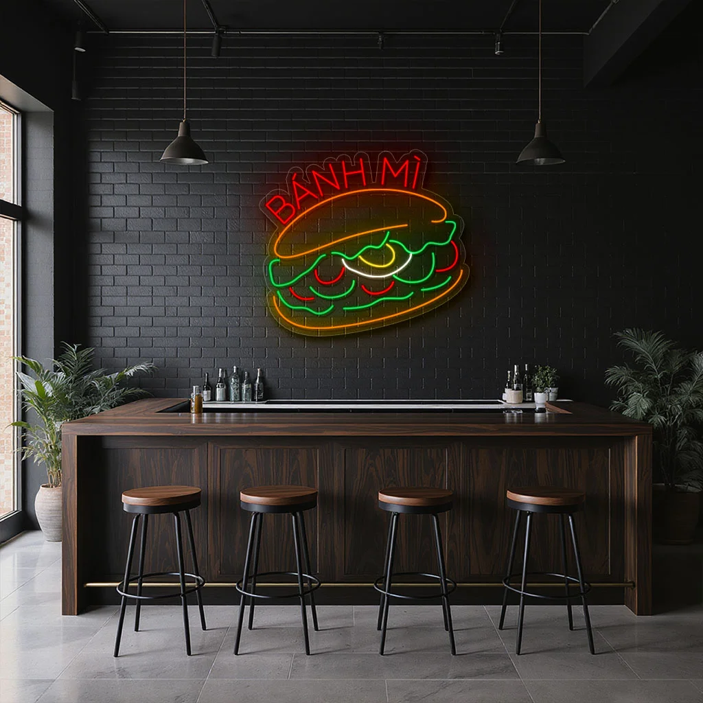 The Neon Sign Banh Mi Vietnamese Sandwich Restaurant Decor is a vibrant, eye-catching neon display designed to bring authentic Vietnamese street food culture into your space. Featuring a colorful depiction of the iconic banh mi sandwich, this neon sign adds a modern, artistic glow perfect for any restaurant, cafe, or home dining area.