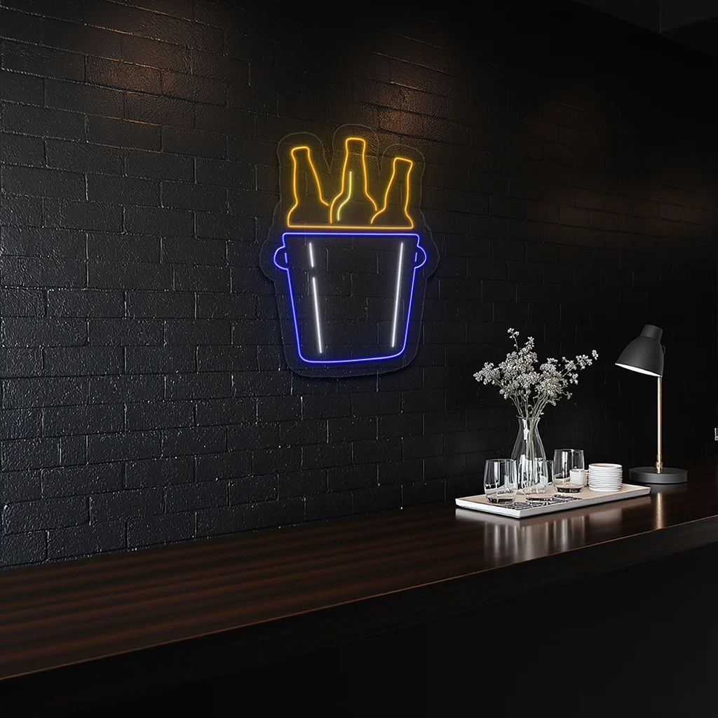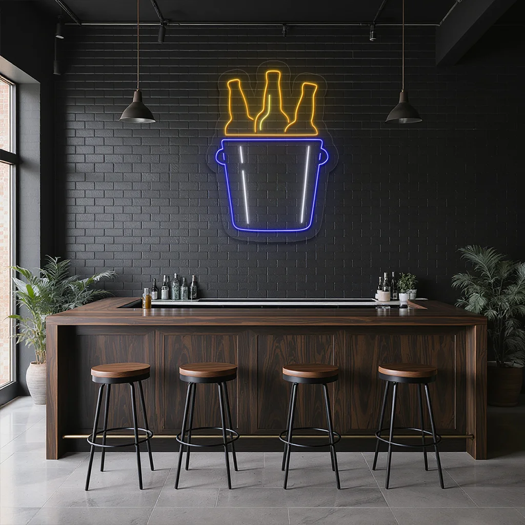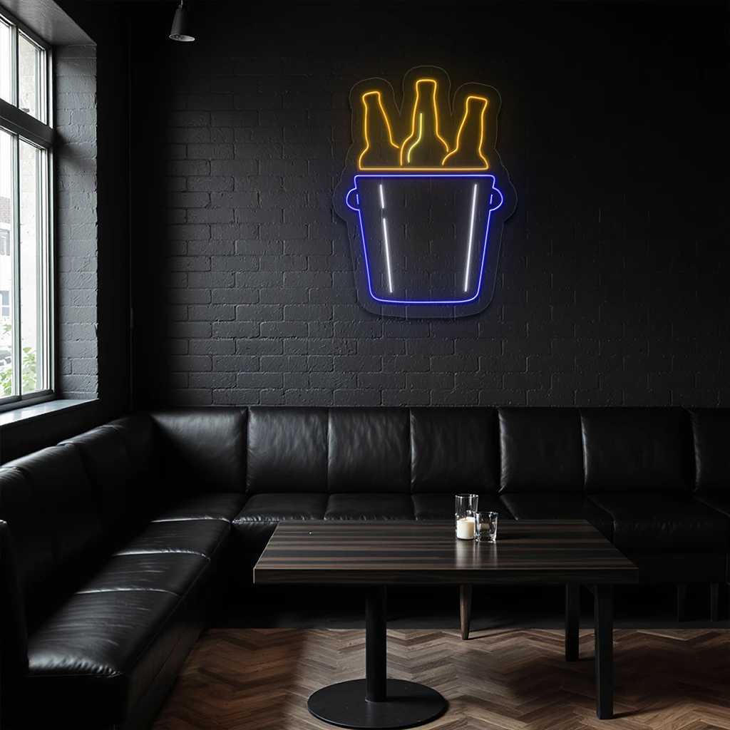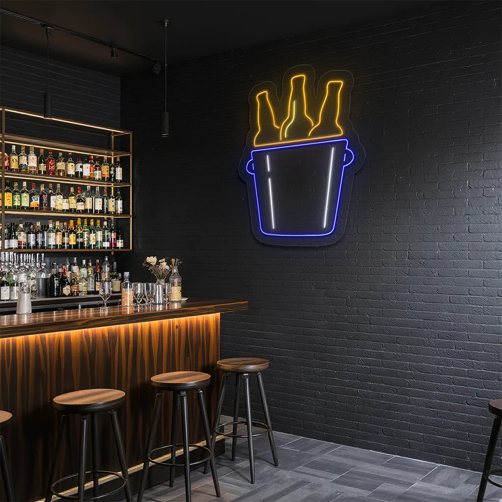 The Neon Sign Beer Bottle Bucket Wall Decor for Bar Counter is a stylish and vibrant addition to any bar or entertainment space. Featuring bold neon outlines of a beer bucket filled with bottles, this eye-catching sign combines warm yellow and cool blue hues to create a dynamic and inviting atmosphere.