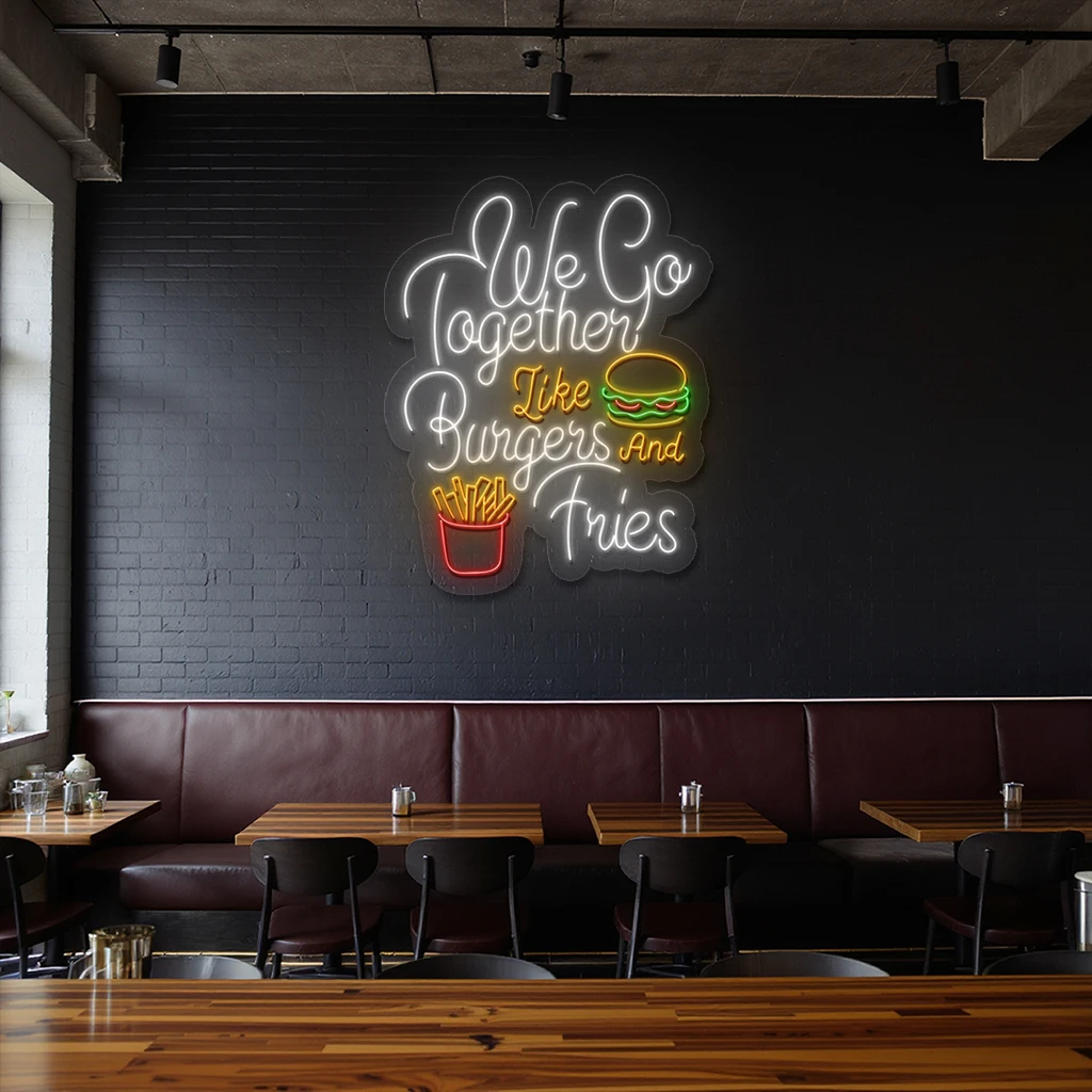 - Pattern and Typography: The flowing cursive script in white neon brings a friendly, handwritten feel that complements the playful imagery. The arrangement of words alongside the burger and fries graphics maintains balance and readability while evoking the nostalgic charm of diner-style signage.