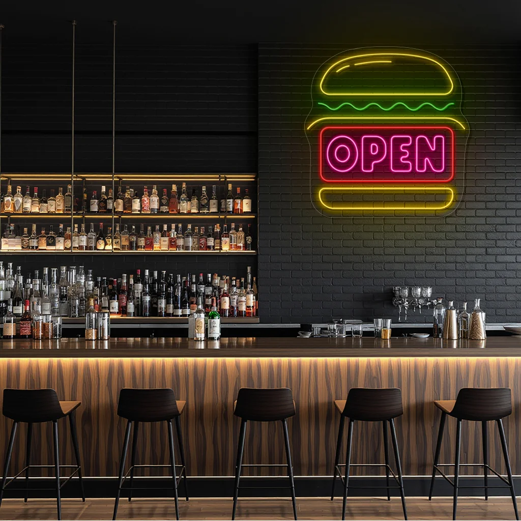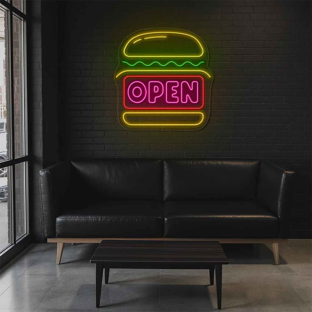 Neon Sign Burger Open Fast Food Restaurant Decor