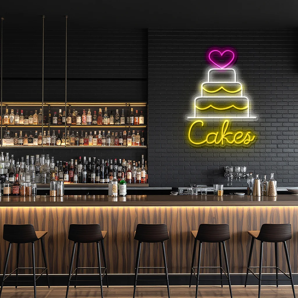 The Neon Sign Cake with Heart Topper and Bakery Decor beautifully captures the charm of a classic tiered cake illuminated with vibrant neon lights. Perfect for adding a warm, inviting glow to any bakery or dessert space, this eye-catching sign combines playful colors and intricate patterns to enhance your decor effortlessly.
