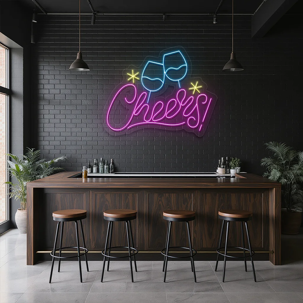Neon Sign Cheers Text with Clinking Glasses Bar Decor