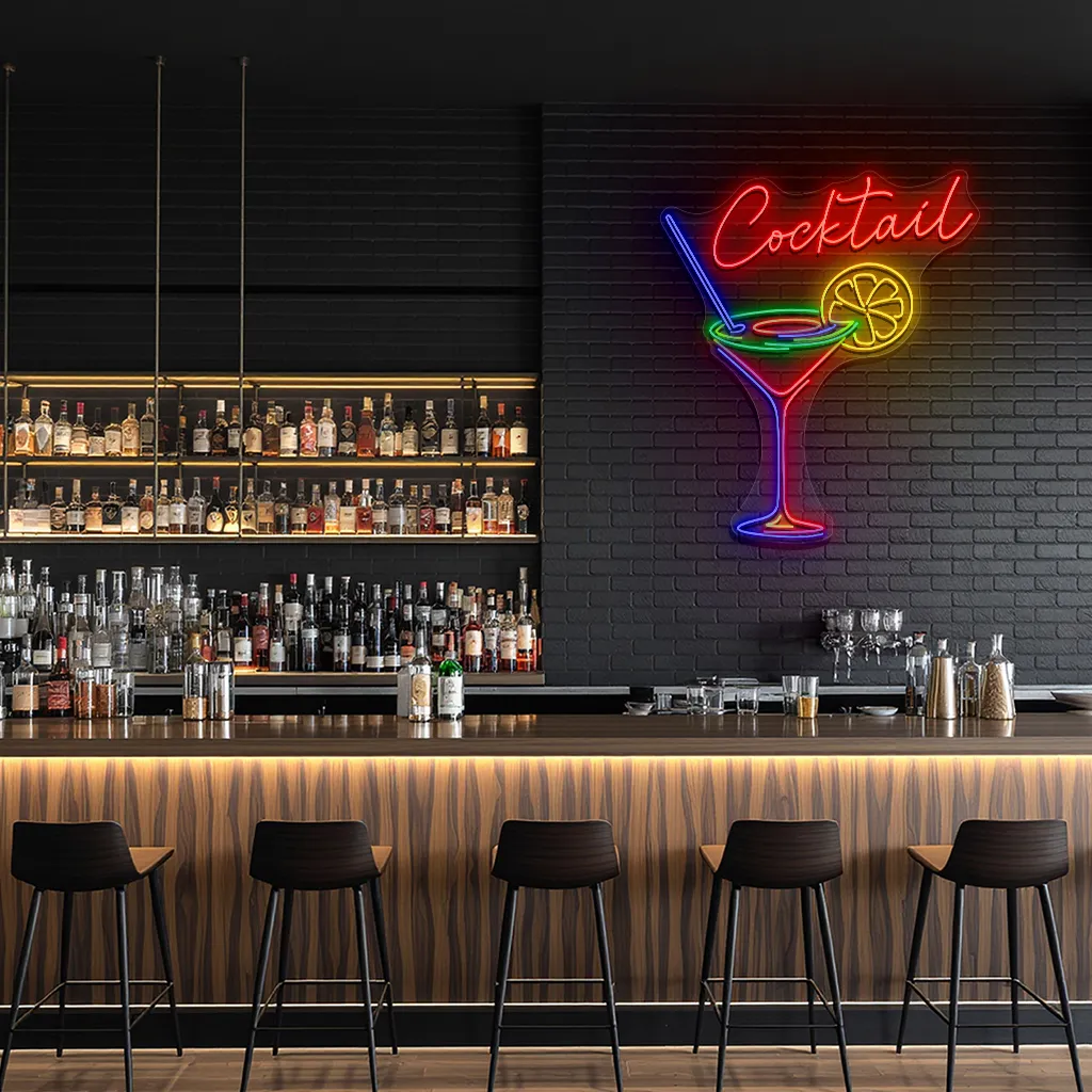 - Striking Color Coordination: The neon sign’s use of glowing red for the word “Cocktail,” contrasted with the electric blue outline of the glass and the cheerful yellow lemon slice, instantly draws attention and sets a fun, energetic tone for your space.