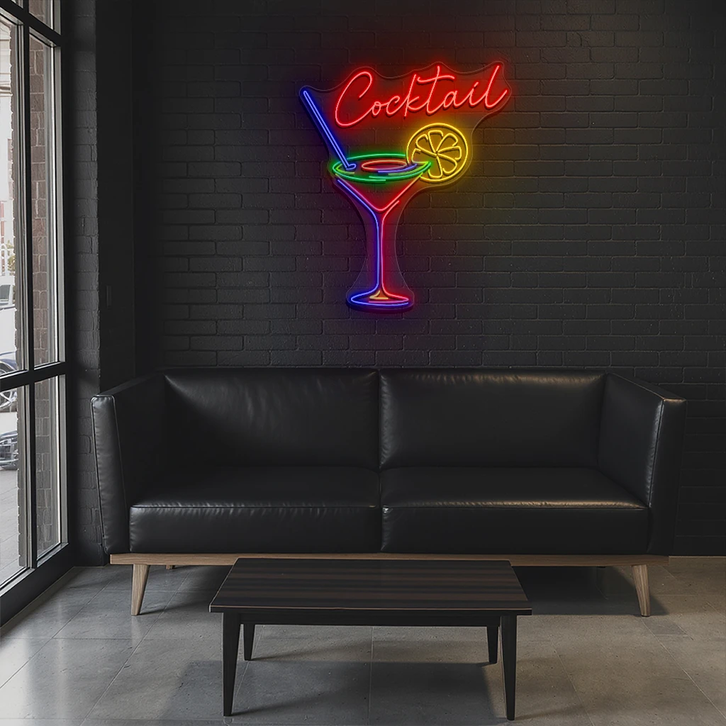 - Dynamic Design Elements: The curved lines of the cocktail glass paired with the circular lemon slice and straight straw create balanced visual interest, blending classic cocktail imagery with modern neon art for a stylish décor piece.
