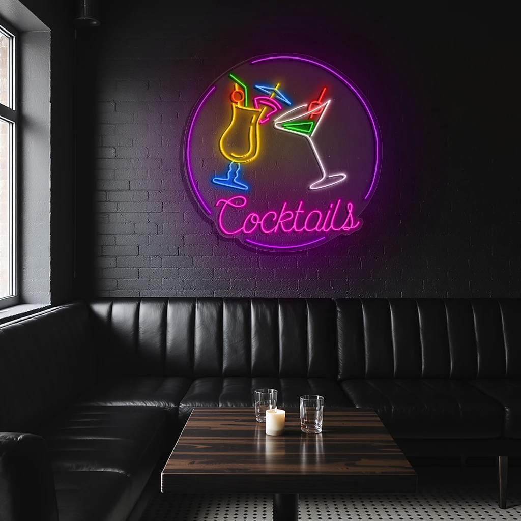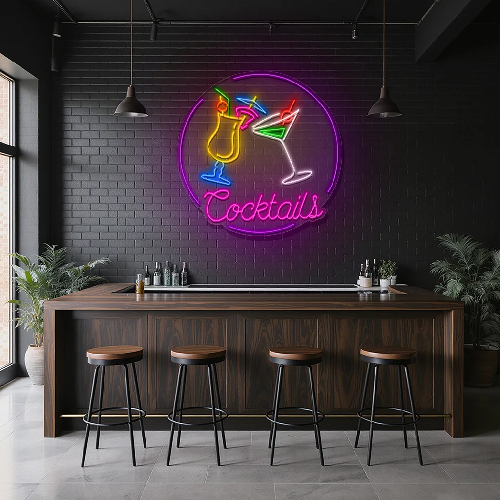 - Dynamic Color Coordination: The neon sign artfully combines bright yellow, blue, green, red, pink, and purple hues, reflecting the playful and diverse nature of cocktails. The vivid colors are expertly balanced to create a harmonious and inviting glow that instantly draws attention.