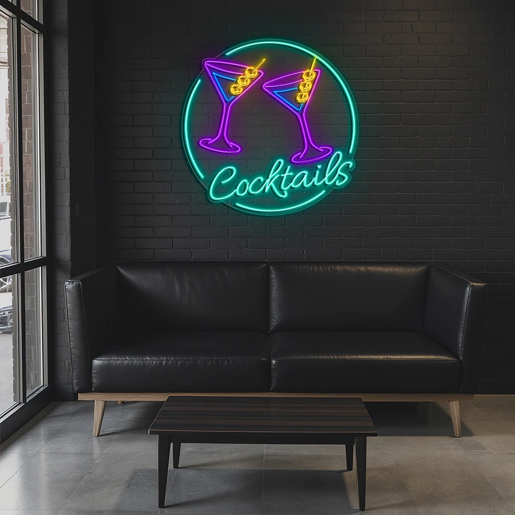 - Vivid Color Coordination: The design uses striking purple for the martini glasses, bright yellow for the olives, and a cool turquoise for the circle and lettering, creating a visually balanced and eye-catching neon display that draws immediate attention.