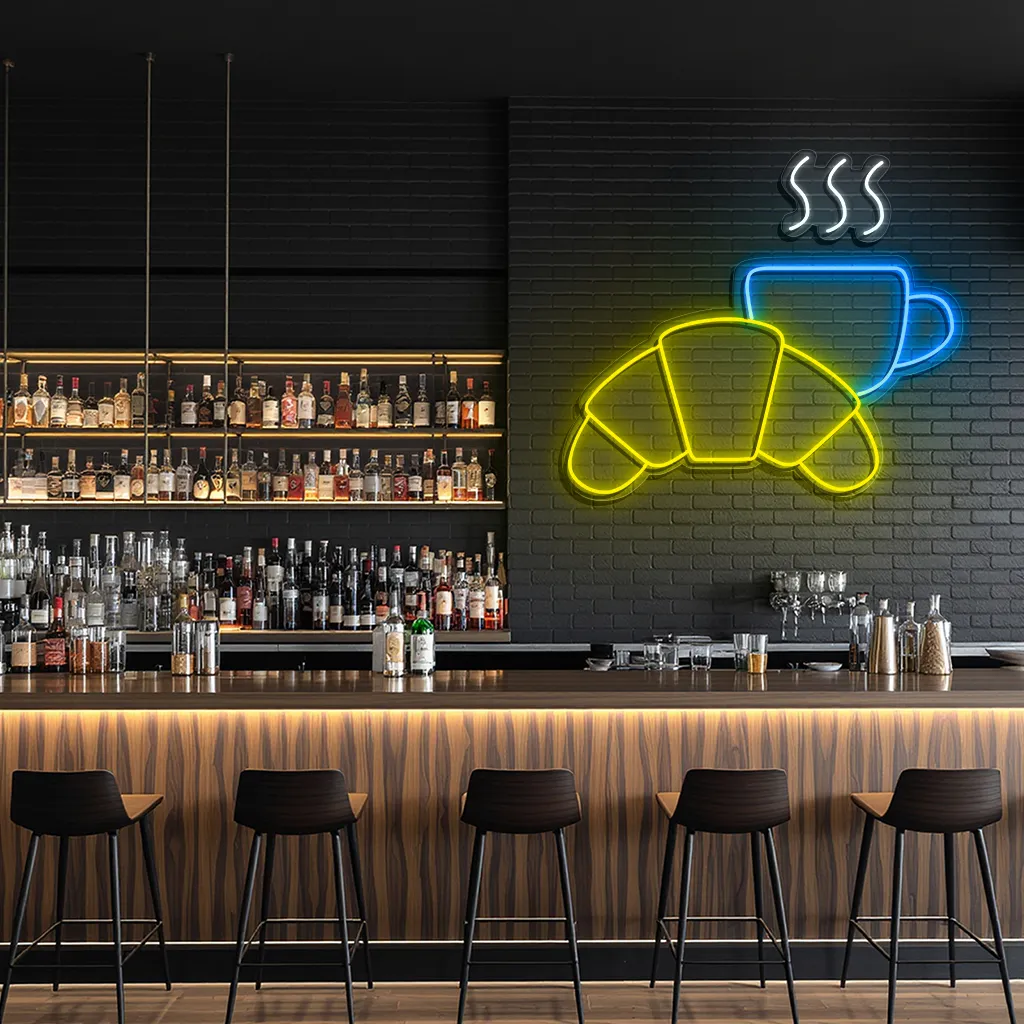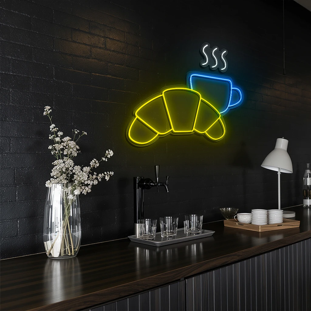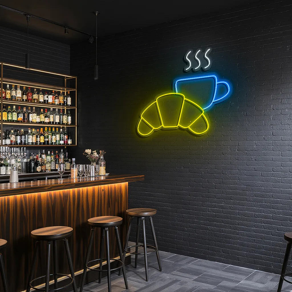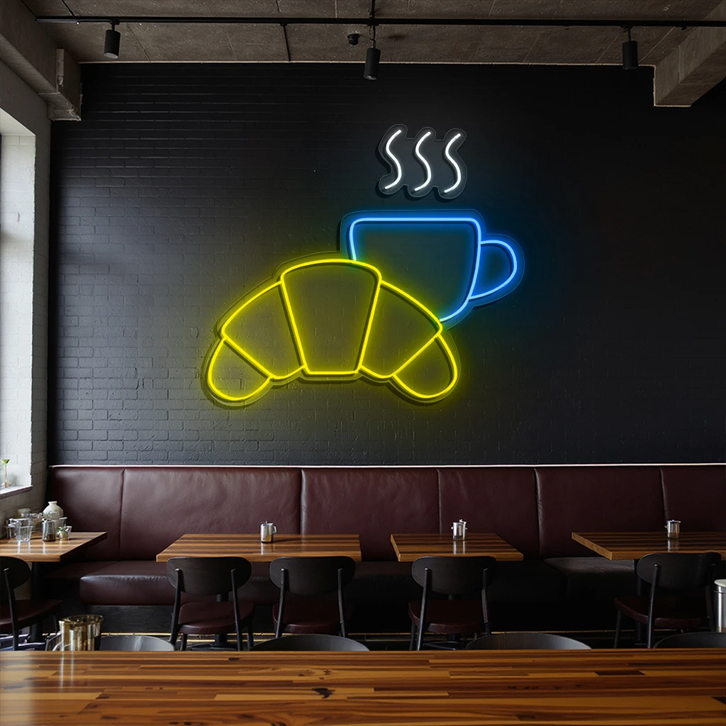 - Vivid Color Coordination: The warm yellow croissant neon emits a cheerful and appetizing glow, while the cool blue coffee cup adds a calming contrast, creating an eye-catching balance that highlights the classic breakfast theme.