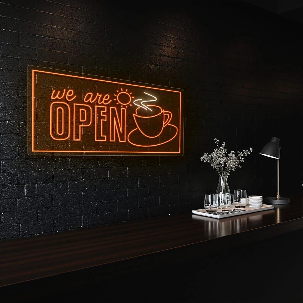 The Neon Sign Coffee Cup We Are Open Text Cafe Decor features a vibrant and inviting design perfect for any coffee shop or cozy cafe. This eye-catching neon sign combines warm orange and crisp white hues to create a welcoming atmosphere while clearly announcing your business is open to customers.