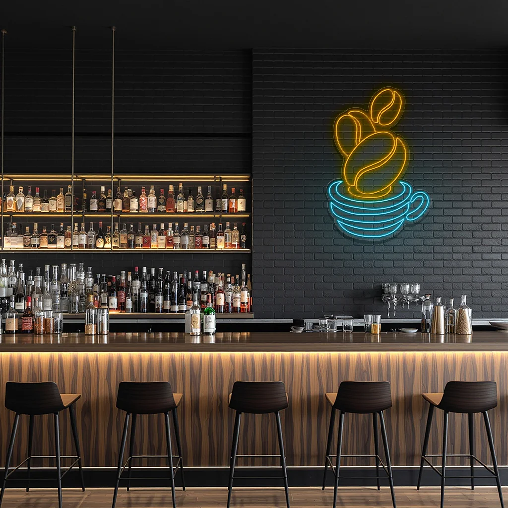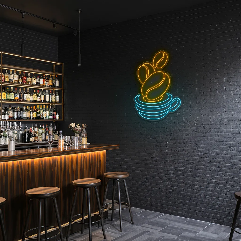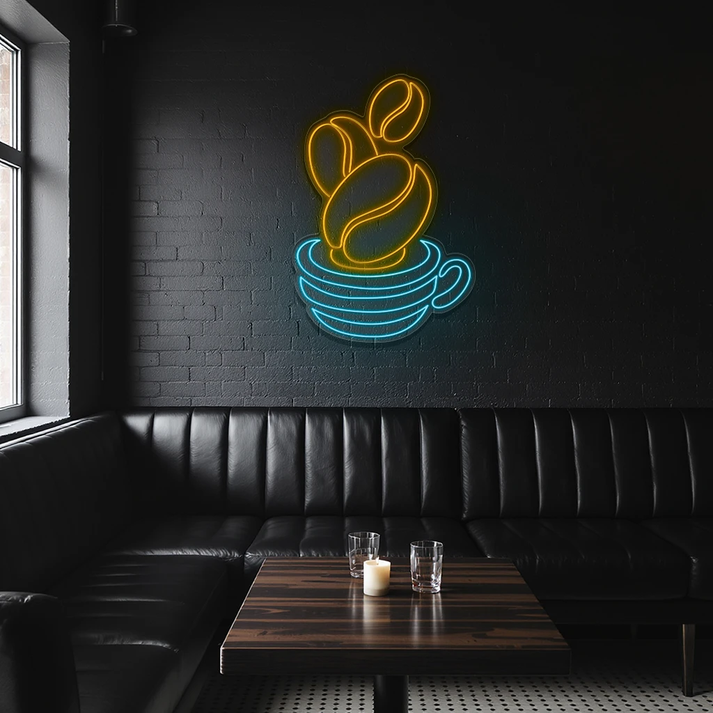 - Color Coordination: The combination of blue and yellow neon lights offers a dynamic and inviting glow. The cool blue cup contrasts beautifully with the warm yellow beans, symbolizing the perfect balance between refreshing and energizing qualities of coffee.