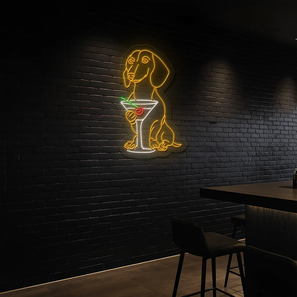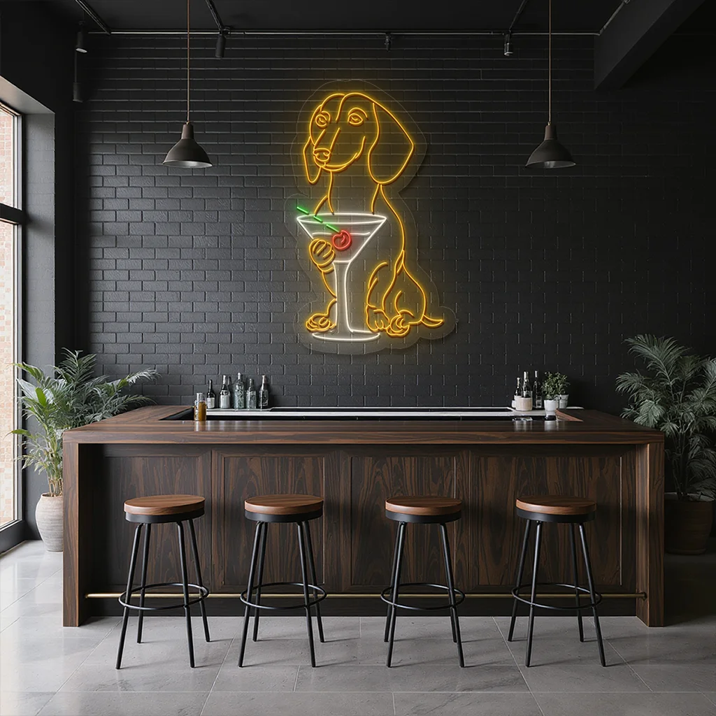 • Eye-catching Color Coordination: The warm yellow neon outlines the dog, creating an inviting and cheerful glow, while the white martini glass contrasts sharply to emphasize the drink. Accents of green and red add a pop of color, symbolizing the olive and cherry garnish, enhancing the overall visual appeal.