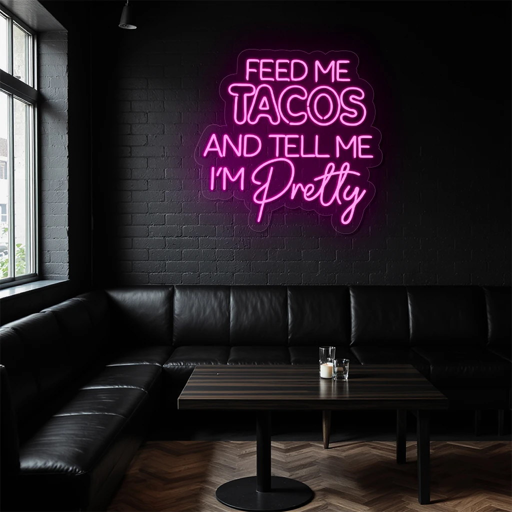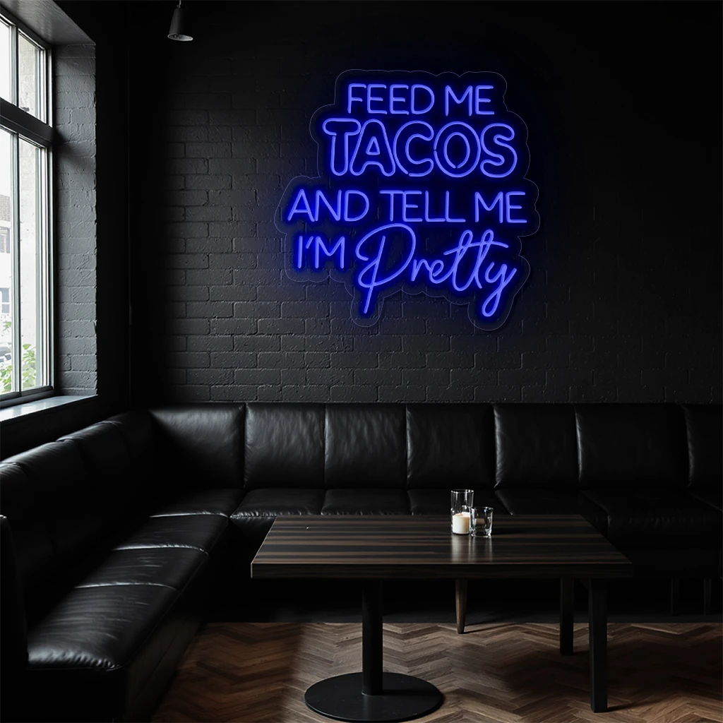 The Neon Sign Feed Me Tacos Text Purple Wall Decor combines bold typography with vibrant purple neon illumination to create an eye-catching statement piece. Ideal for adding playful personality to any room, this sign perfectly balances modern design with fun, making it a must-have for taco lovers and trendsetters alike.