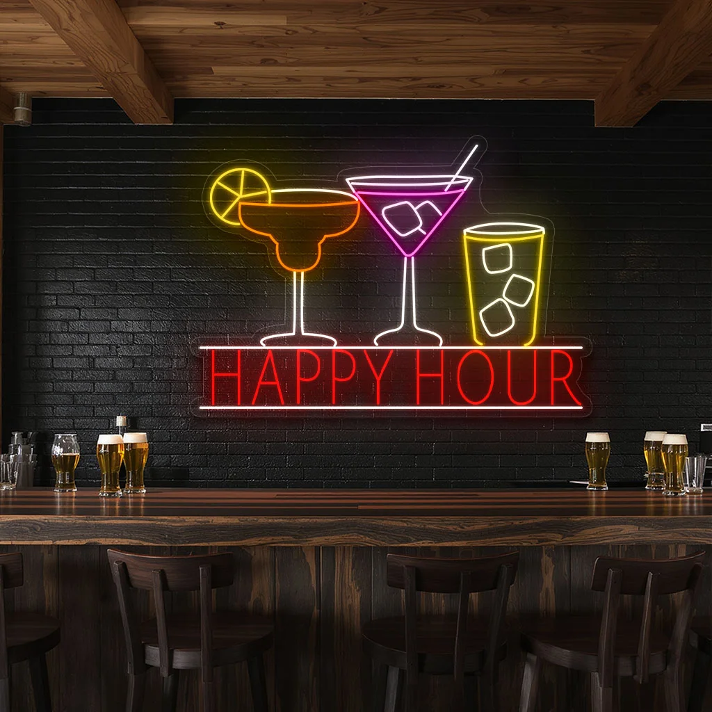- Vibrant, Coordinated Colors: The sign uses a harmonious blend of neon colors—bright yellow for the lemon slice and highball glass, orange for the margarita glass, vivid pink for the martini glass, and striking red for the “HAPPY HOUR” text—creating an inviting and cheerful atmosphere that effortlessly catches the eye.