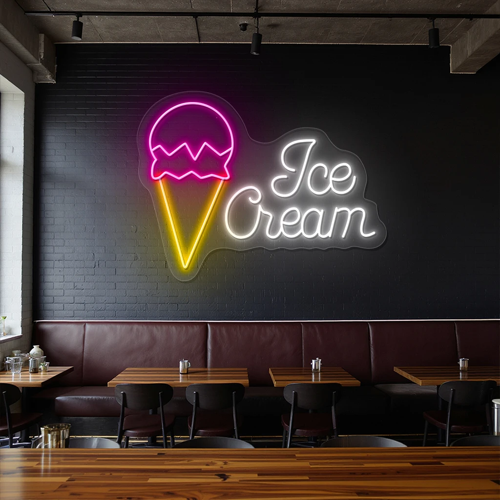 - Vivid Neon Colors: The sign showcases a bright pink ice cream scoop contrasted with a warm yellow cone, paired with crisp white text that says “Ice Cream.” This harmonious color coordination creates a dynamic visual appeal that is both inviting and instantly recognizable.