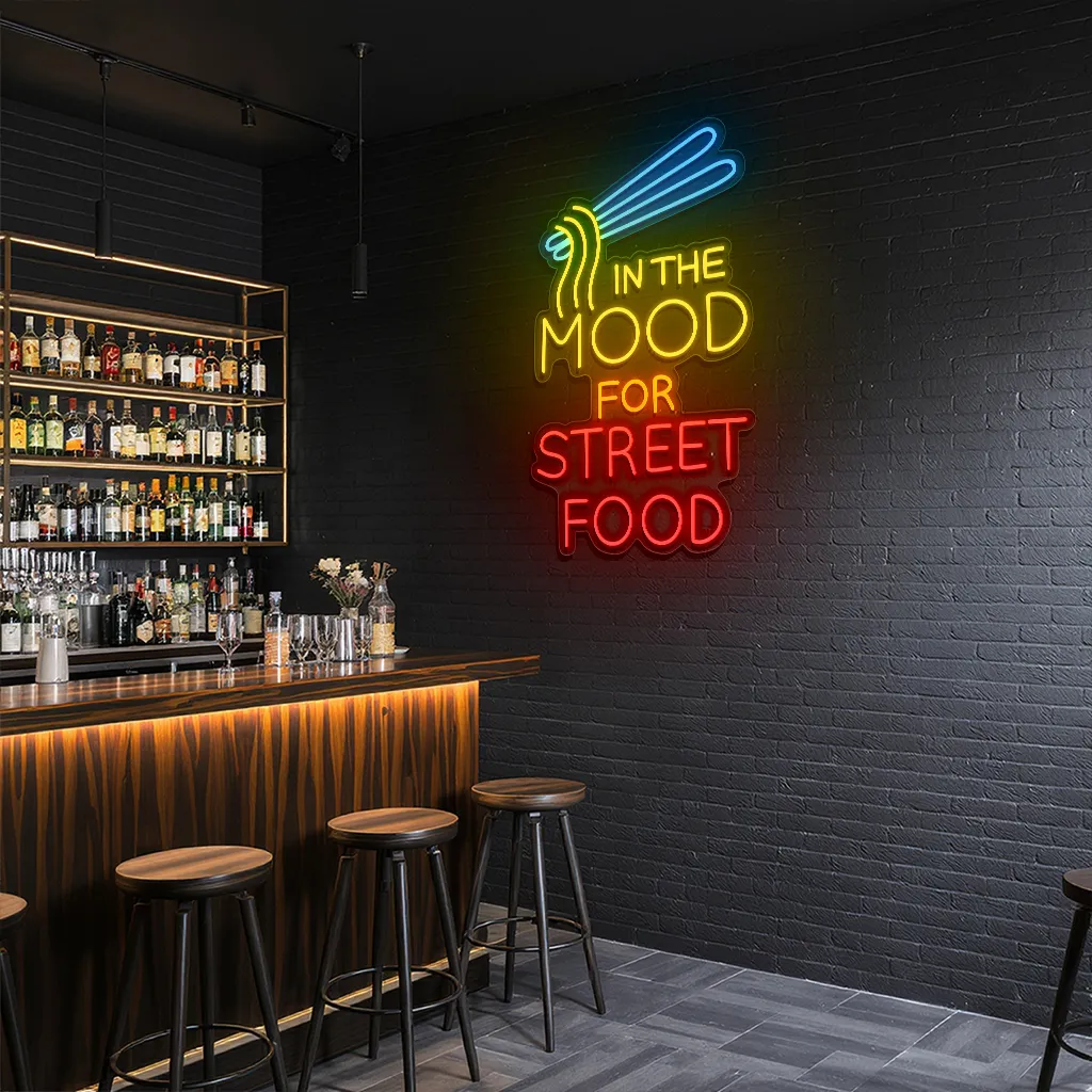 The Neon Sign In The Mood For Street Food with Noodles Icon is a vibrant and eye-catching decor piece designed for food enthusiasts and urban eatery spaces. Combining bright neon colors with playful imagery, this sign instantly conveys a fun and inviting atmosphere perfect for kitchens, restaurants, or street food corners.