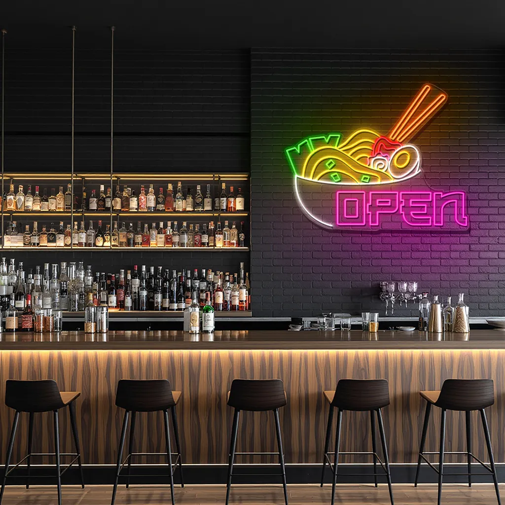 Neon Sign Japanese Ramen Bowl with Chopsticks Open Sign for Resta