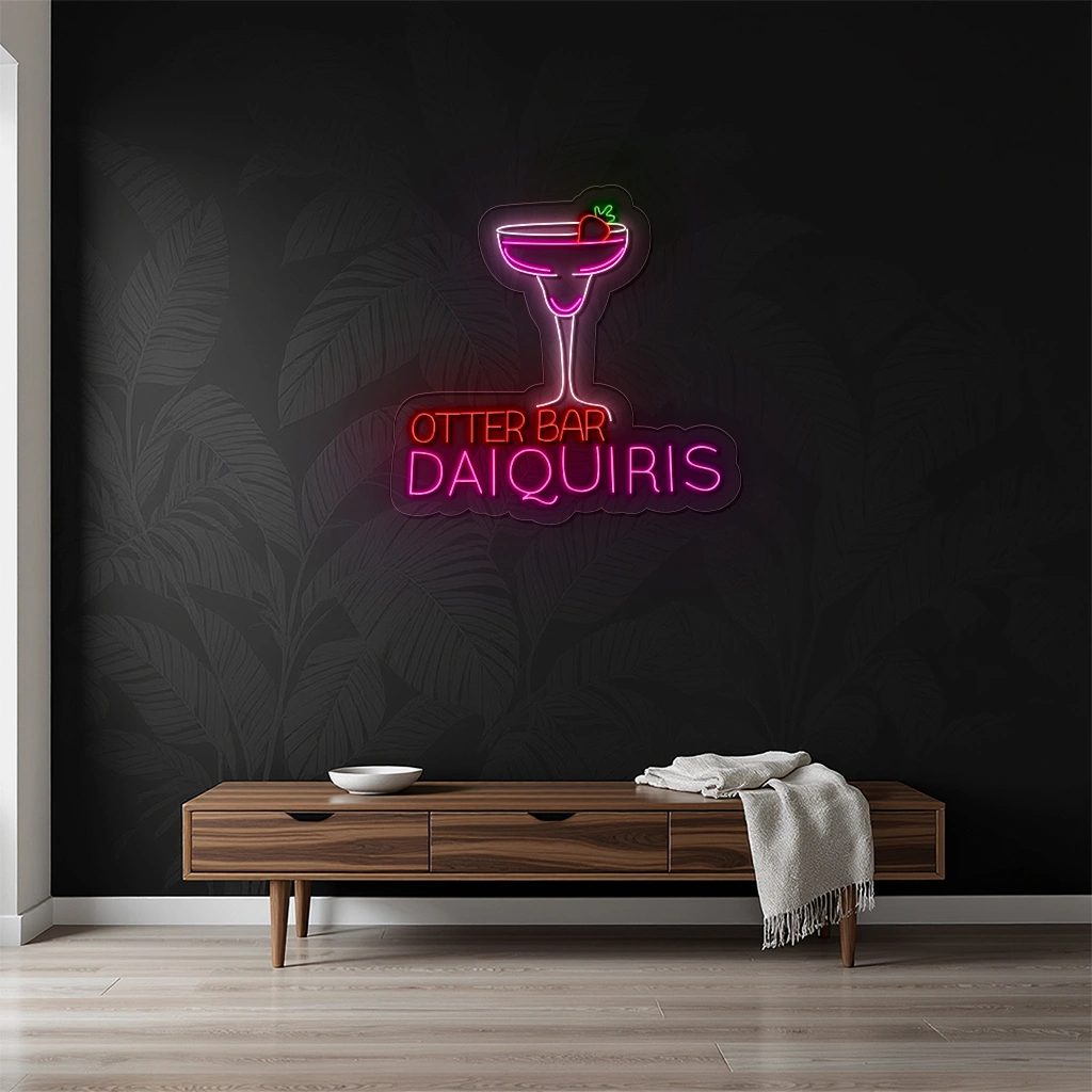 - Vivid Color Coordination: The neon sign combines warm red and pink hues for the “OTTER BAR” and “DAIQUIRIS” text, contrasted by the bright white and green details in the cocktail glass and garnish. This carefully chosen palette creates an inviting and energetic ambiance ideal for social spaces.