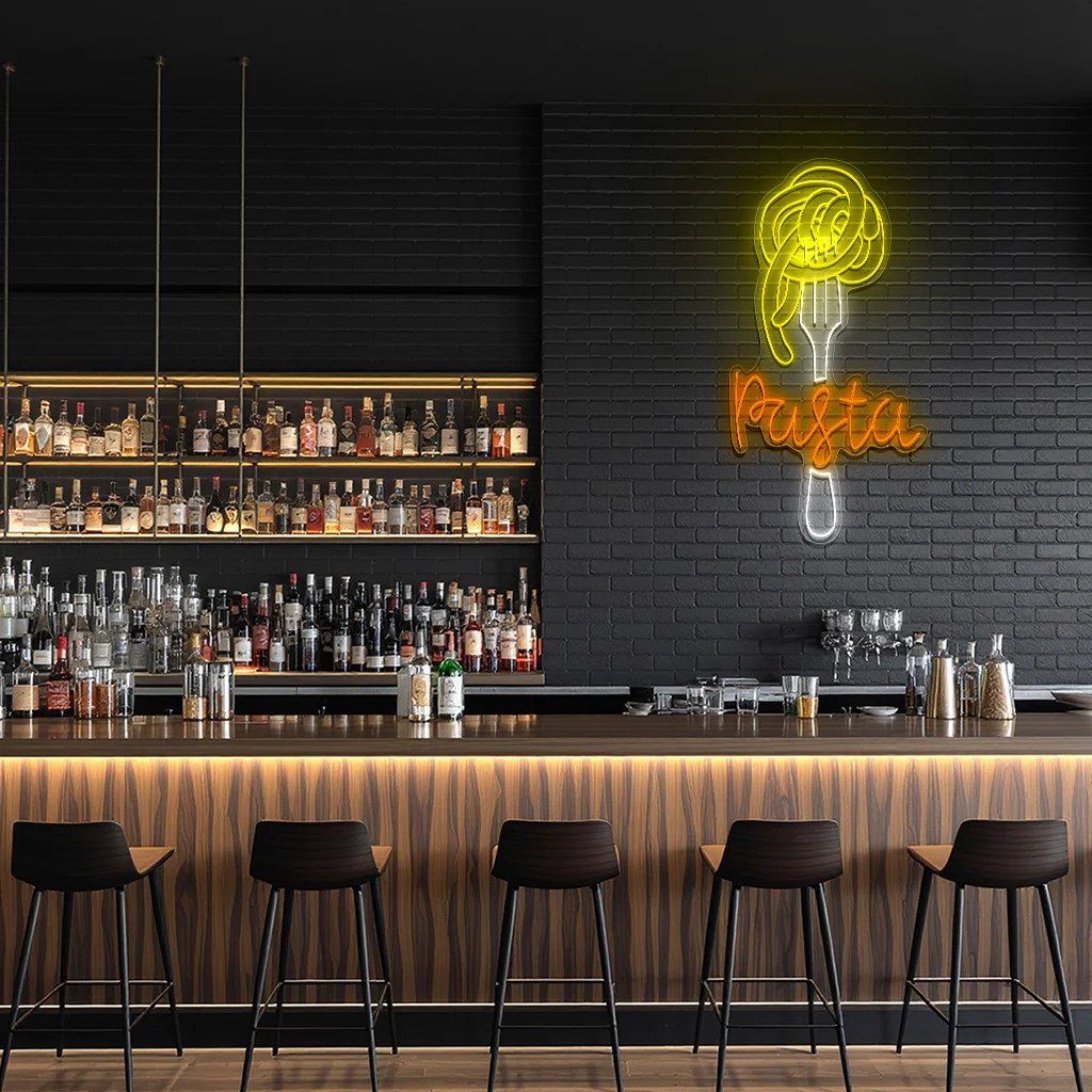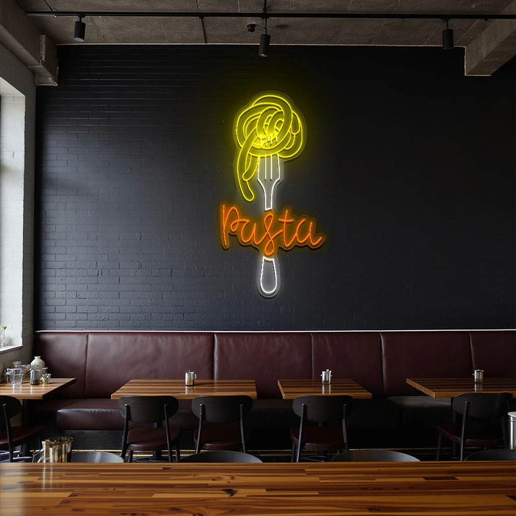 - Eye-Catching Color Coordination: The neon sign uses a vivid yellow to illustrate the pasta, contrasting beautifully with the clean white fork and the inviting orange script of “Pasta,” creating a warm and welcoming ambiance that draws attention and enhances restaurant decor.