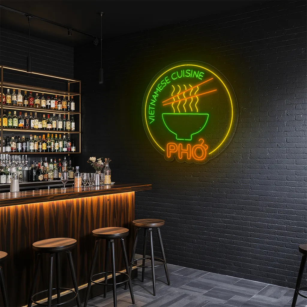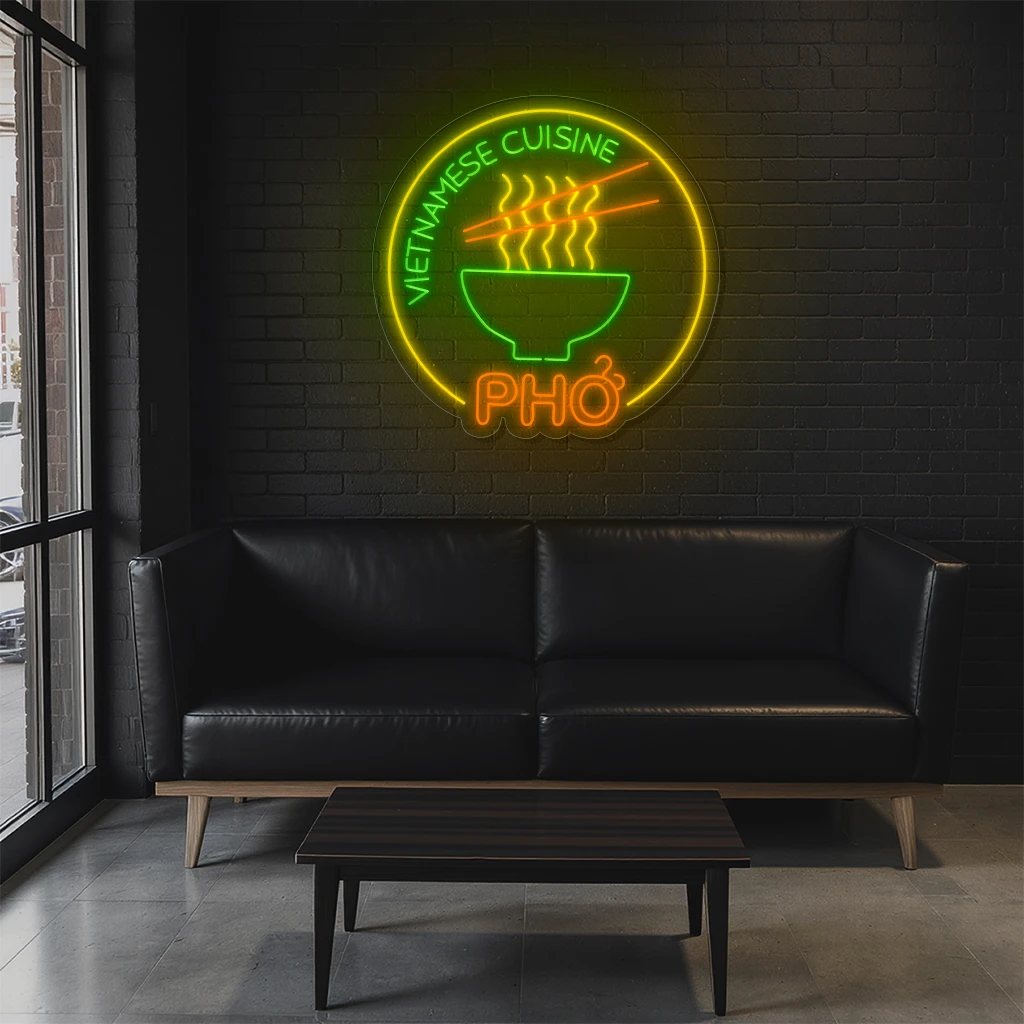 - Clear & Readable Text: The neon text “Vietnamese Cuisine” in green and “PHỞ” in bold orange stand out clearly, helping to brand your space and attract pho lovers instantly.