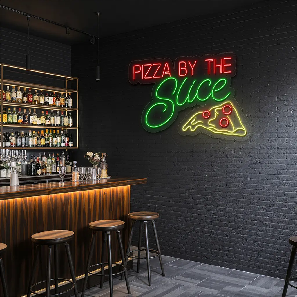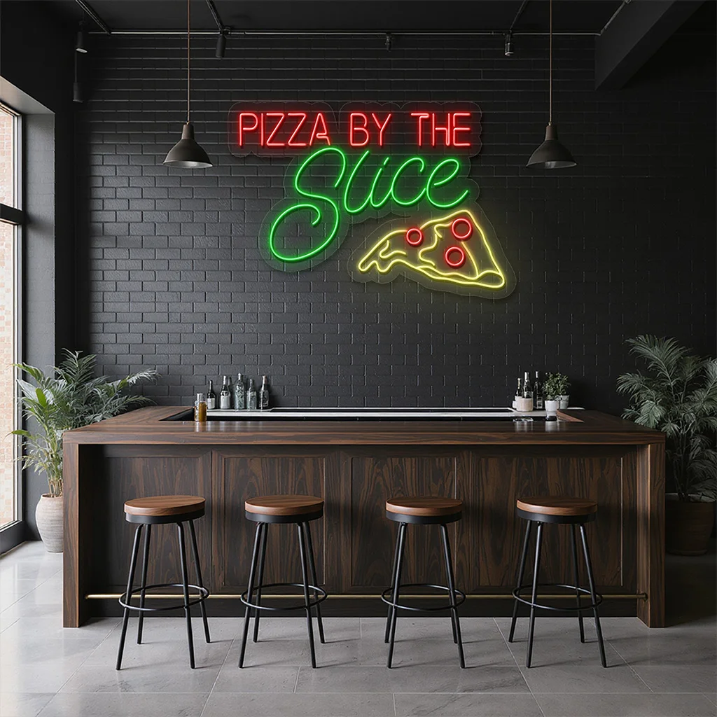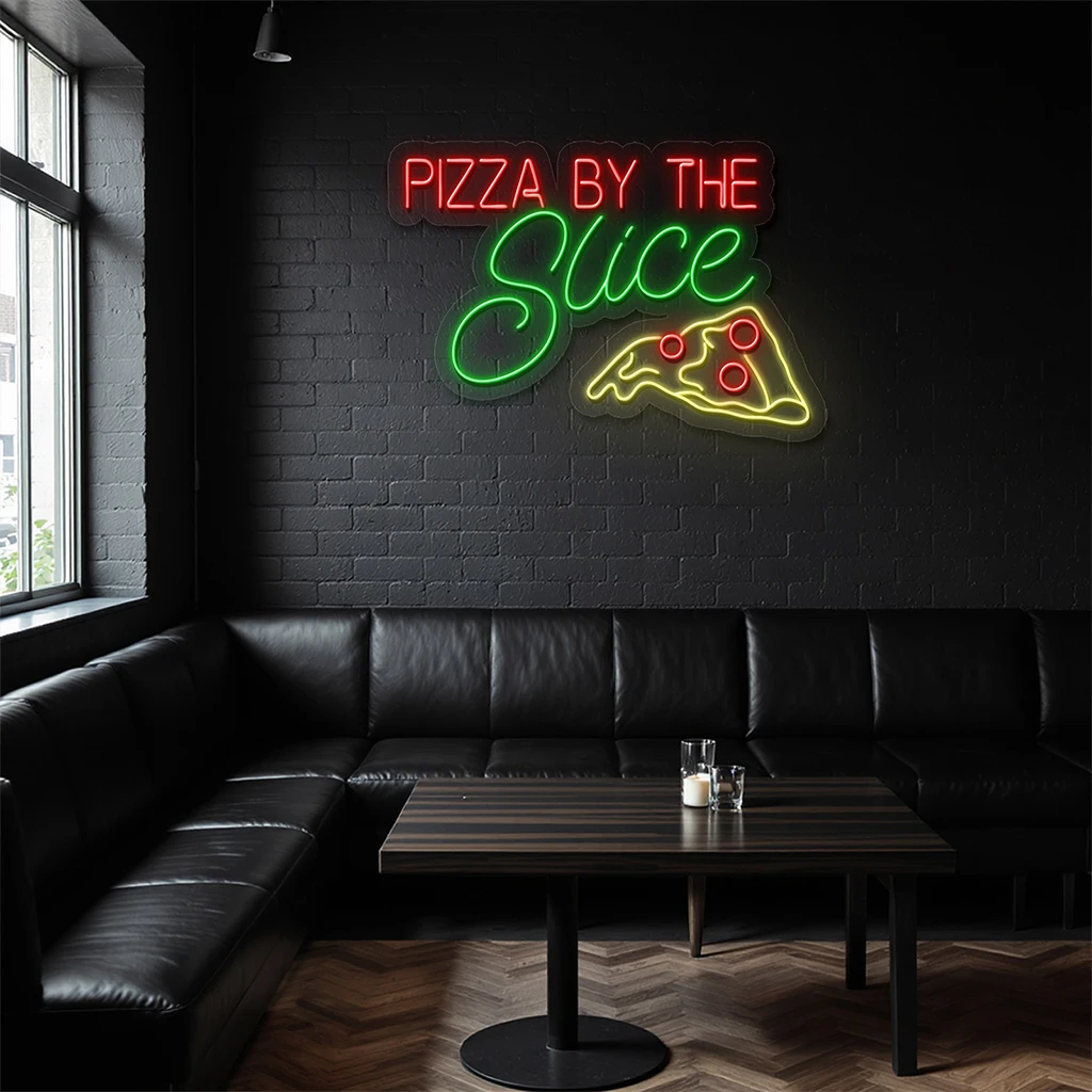 - Color Coordination: The sign uses a striking combination of red, green, and yellow neon lights to evoke the classic pizza experience. The red “PIZZA BY THE” text grabs immediate attention, while the green “Slice” brings a fresh and appetizing vibe. The yellow slice icon outlined with red pepperoni details adds a playful yet delicious touch.