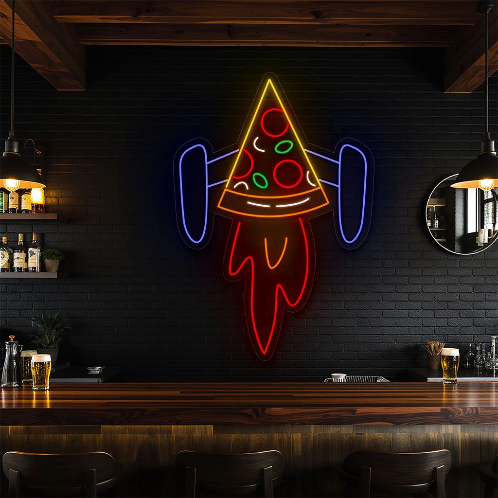 - Dynamic Shape: The rocket shape cleverly integrates the pizza slice, with sleek blue boosters and flame-like red neon trails that evoke energy and motion, adding a dynamic element that livens up any space.