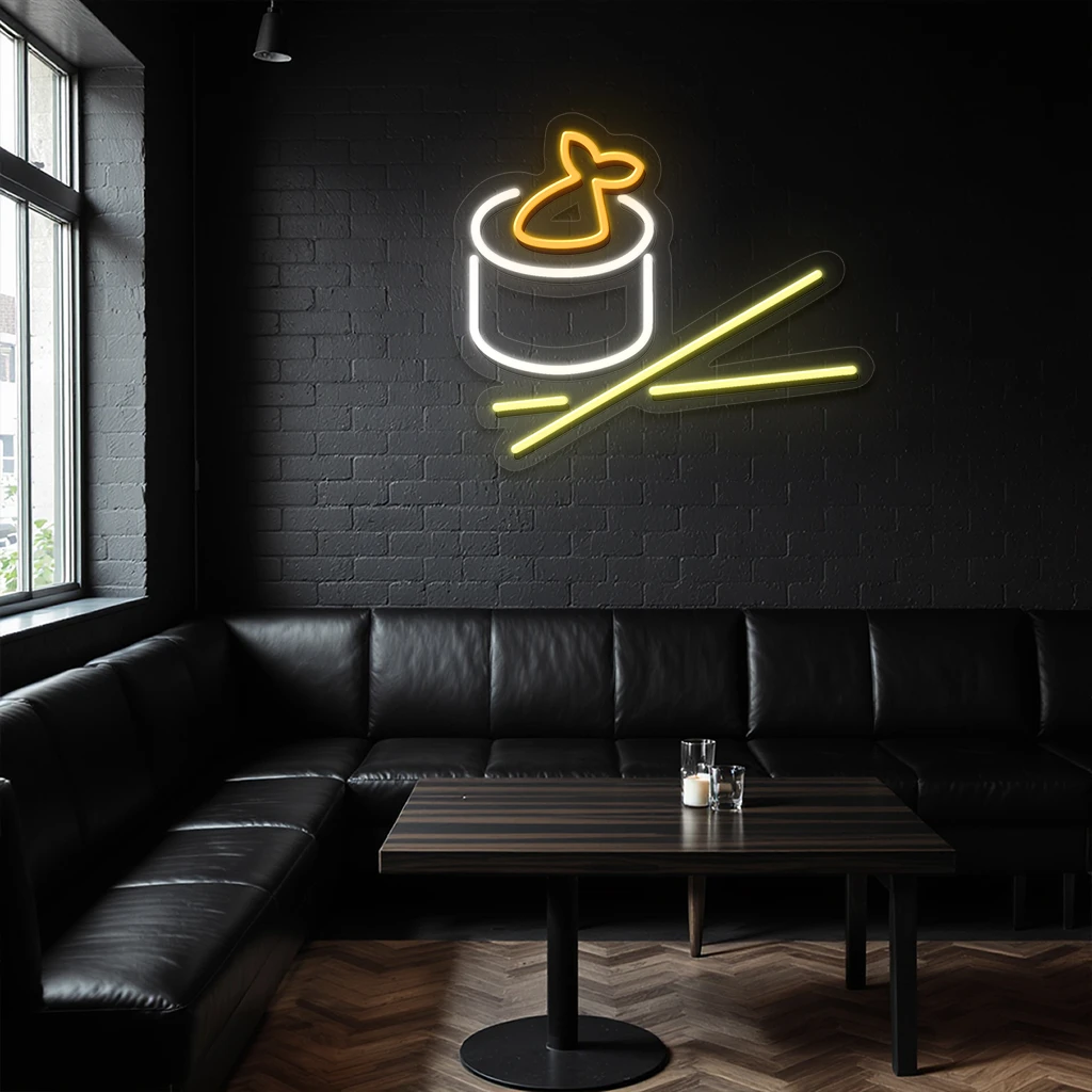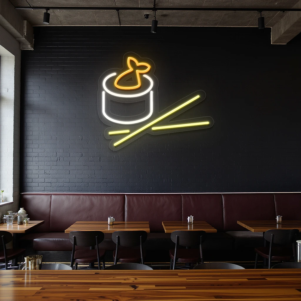 - Striking Color Coordination: The neon sign uses a palette of bright white for the sushi roll, warm orange for the shrimp topping, and luminous yellow for the chopsticks. This harmonious color combination not only highlights the distinct elements of the sushi roll but also creates an appealing and inviting atmosphere.