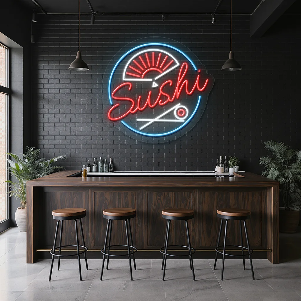 - Striking Color Coordination: The neon sign uses a dynamic palette of red, blue, and white, with the red “Sushi” text glowing prominently against the cool blue circular outline. This contrast ensures high visibility and instantly draws the eye, reinforcing the sushi theme with vivid energy.