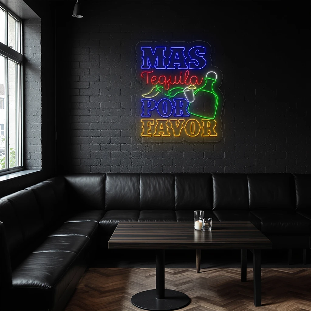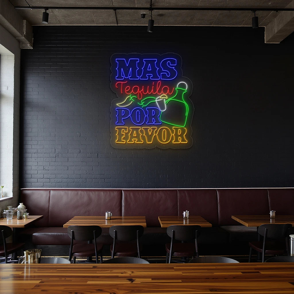 - Clear and Bold Typography: The alternating blue and yellow lettering for “MAS POR FAVOR” paired with the red “Tequila” script ensures readability and highlights the message with playful emphasis.