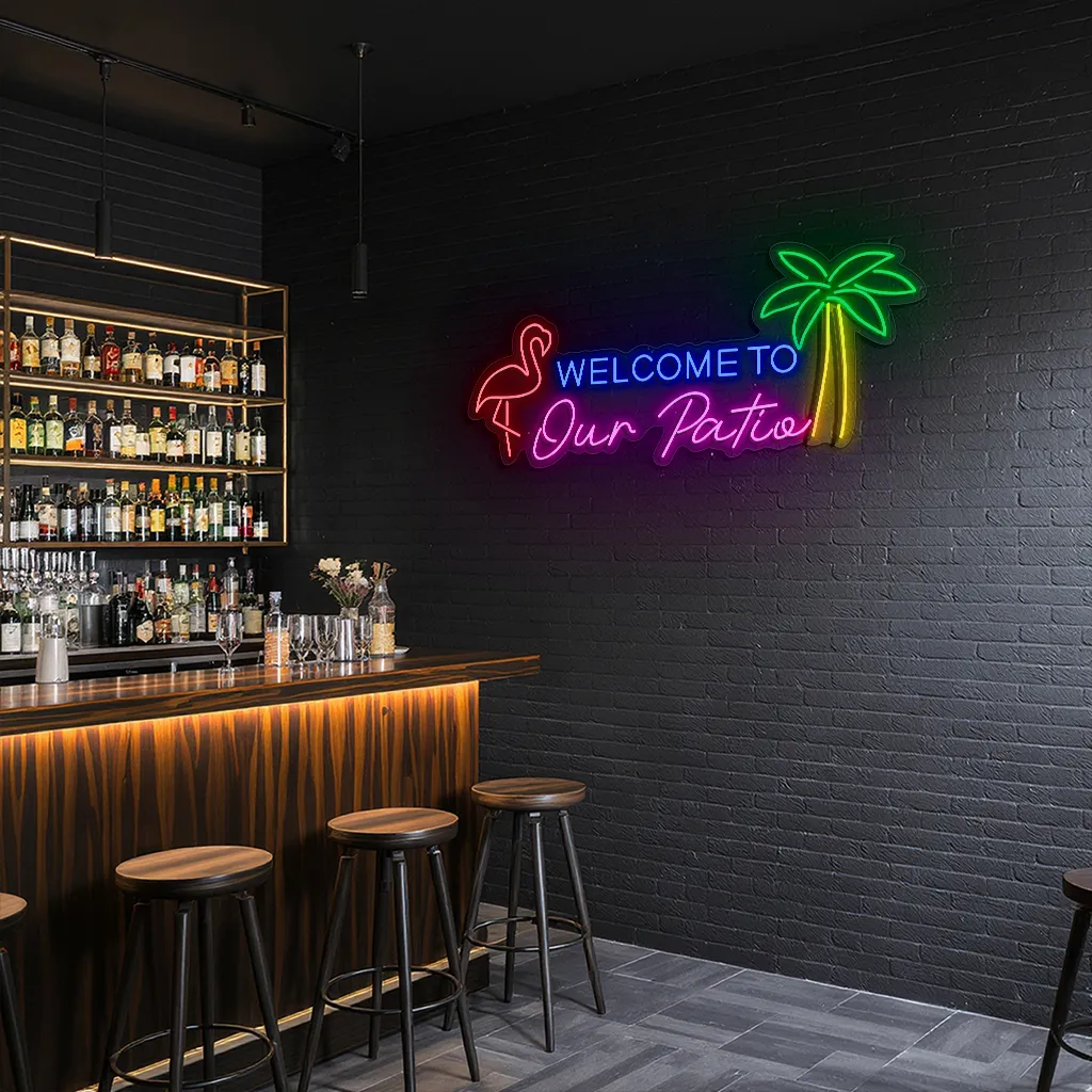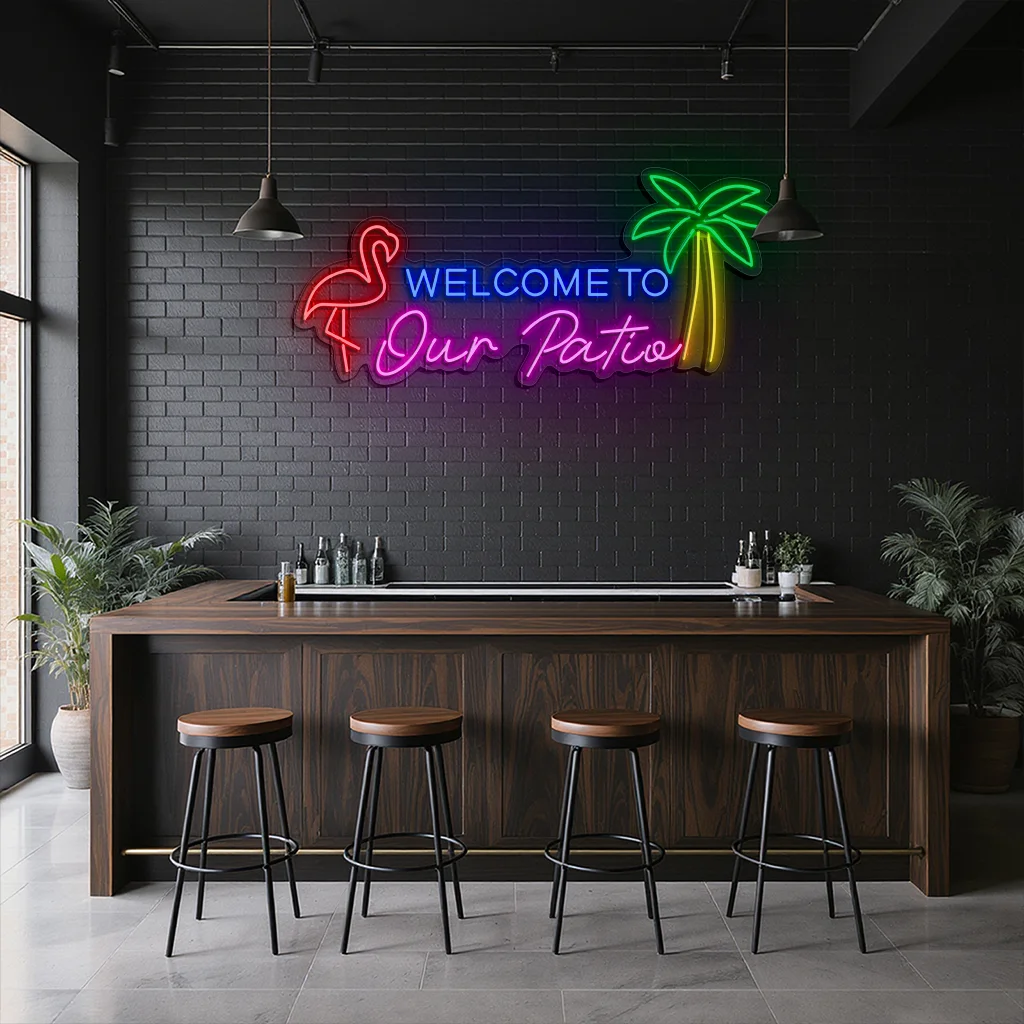 - Welcoming Text in Multiple Hues: The phrase “Welcome to Our Patio” is illuminated with a combination of blue and magenta neon lights, creating a warm, friendly greeting that instantly sets a positive tone for guests.