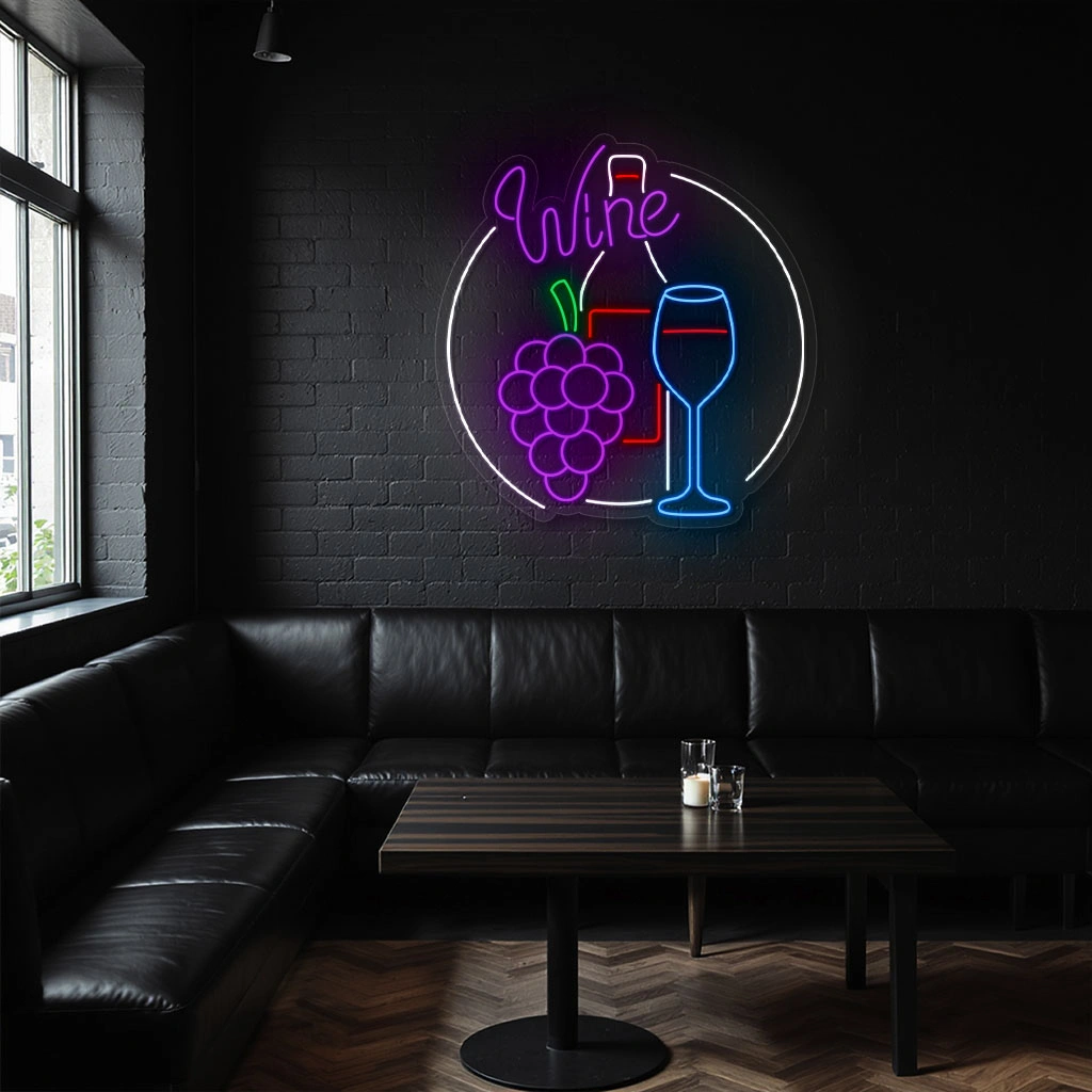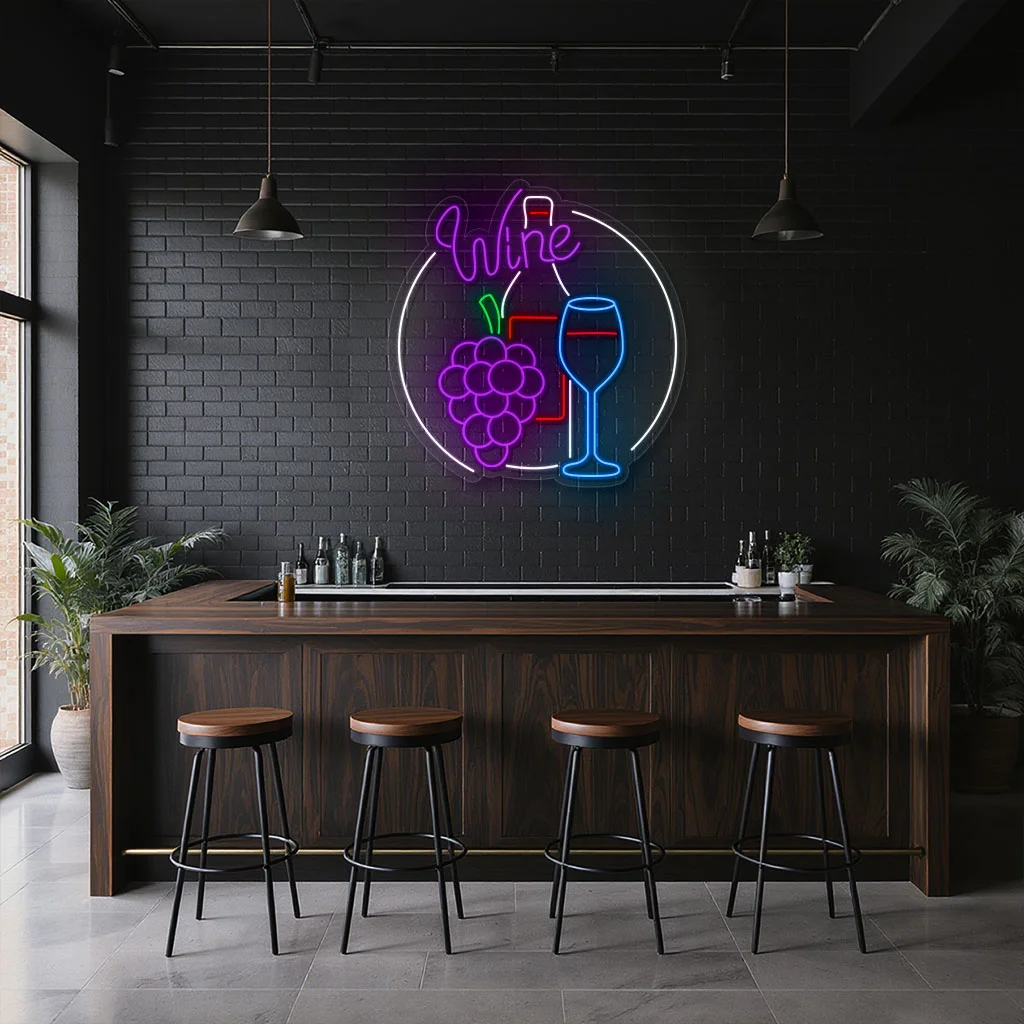- Vivid Color Coordination: The neon sign uses rich purple hues for the grapes, bright green for the stems, deep red accents on the bottle and wine glass, and an electric blue outline for the glass. These carefully chosen colors create an eye-catching contrast that highlights each element beautifully.