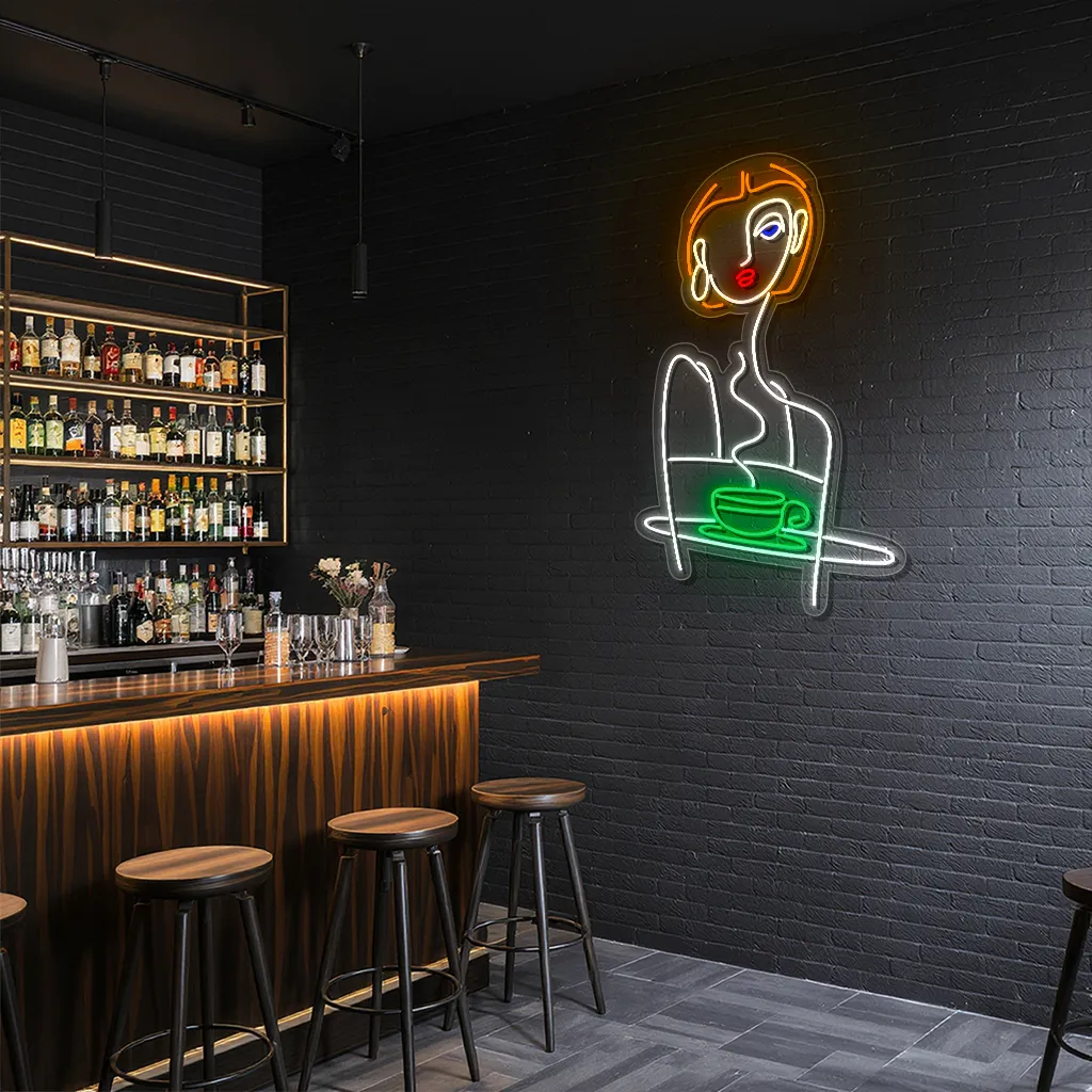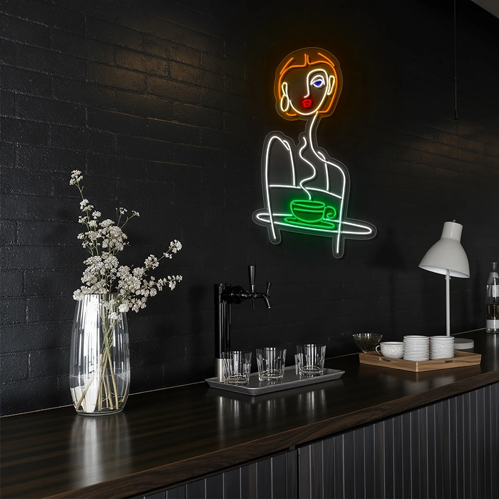 - Artistic Line Design: The sleek white neon outline forms the woman’s figure and coffee cup, offering a minimalist but striking visual that draws attention without overwhelming your space.