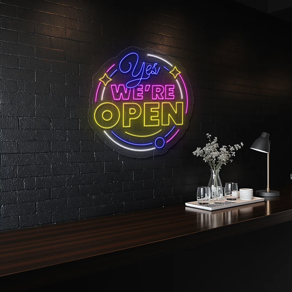 - Color Coordination: The neon sign expertly uses a vibrant palette with electric blue for “Yes,” bold magenta for “WE’RE,” and bright yellow for “OPEN,” creating a striking contrast that immediately grabs attention and enhances visibility, day or night.