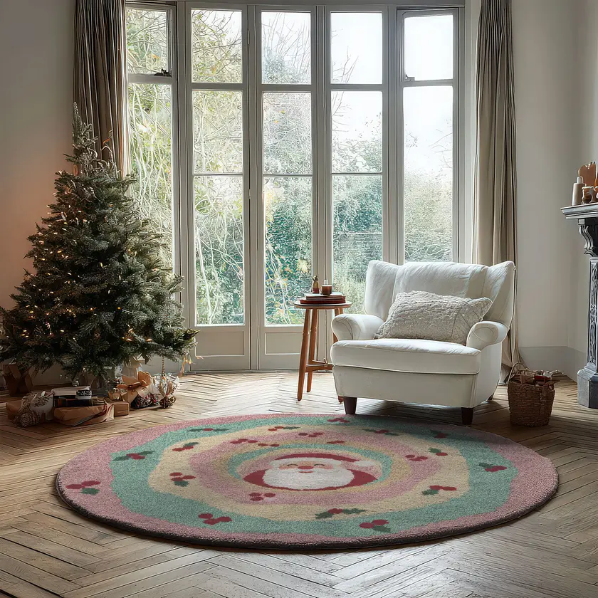 - 3D Illusion Design: The circular pattern draws the eye inward, creating a captivating three-dimensional effect that highlights Santa’s smiling face and enhances the rug’s visual appeal.