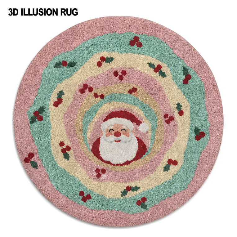 The Pink Green Santa 3D Illusion Rug Perfect For Holiday Decor is a charming round rug designed to bring festive cheer to any room. Featuring concentric circles in soft pink, mint green, and creamy tones, it beautifully frames a joyful Santa Claus at the center, making it an eye-catching and whimsical addition to your holiday decorations.