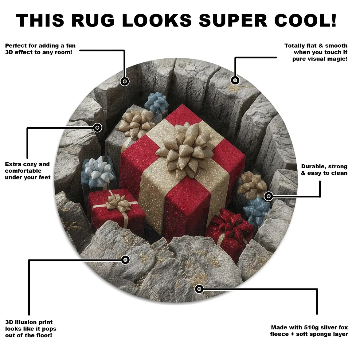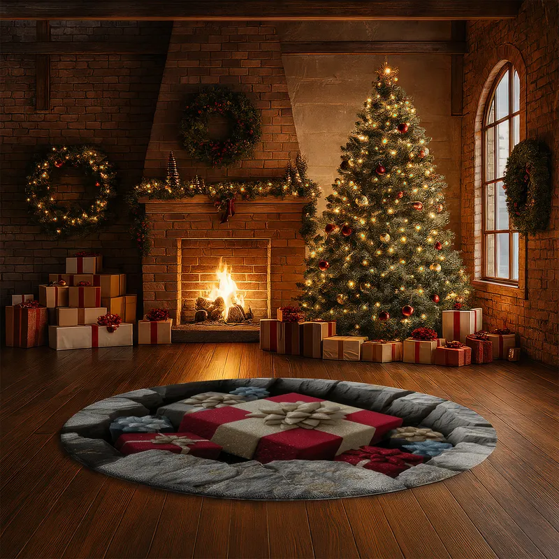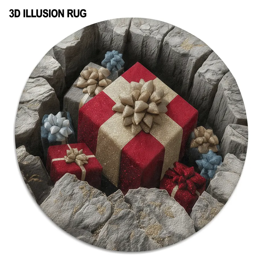 - 3D Illusion Design: Expertly crafted to mimic depth and dimension, the pattern gives the illusion of presents sinking into rugged stone, adding a playful yet artistic element to your decor.