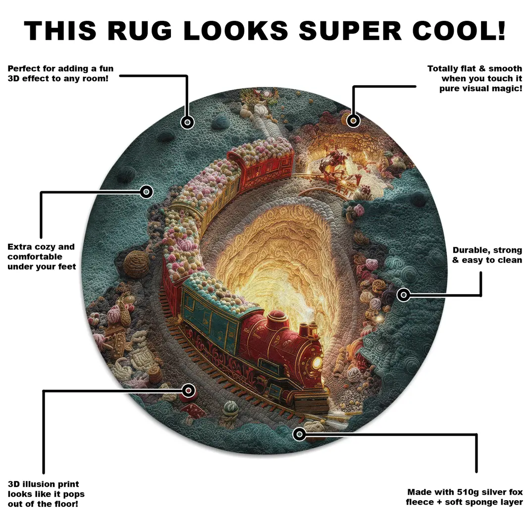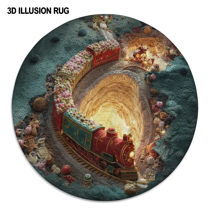 The Red Blue 3D Train Illusion Rug – Unique Home Decor Piece is an eye-catching circular rug that transforms any room with its vibrant colors and intricate design. Featuring a whimsical train journey through a tunnel, this rug combines deep reds, blues, and soft pastel tones to create a captivating 3D visual effect that enlivens your living space.