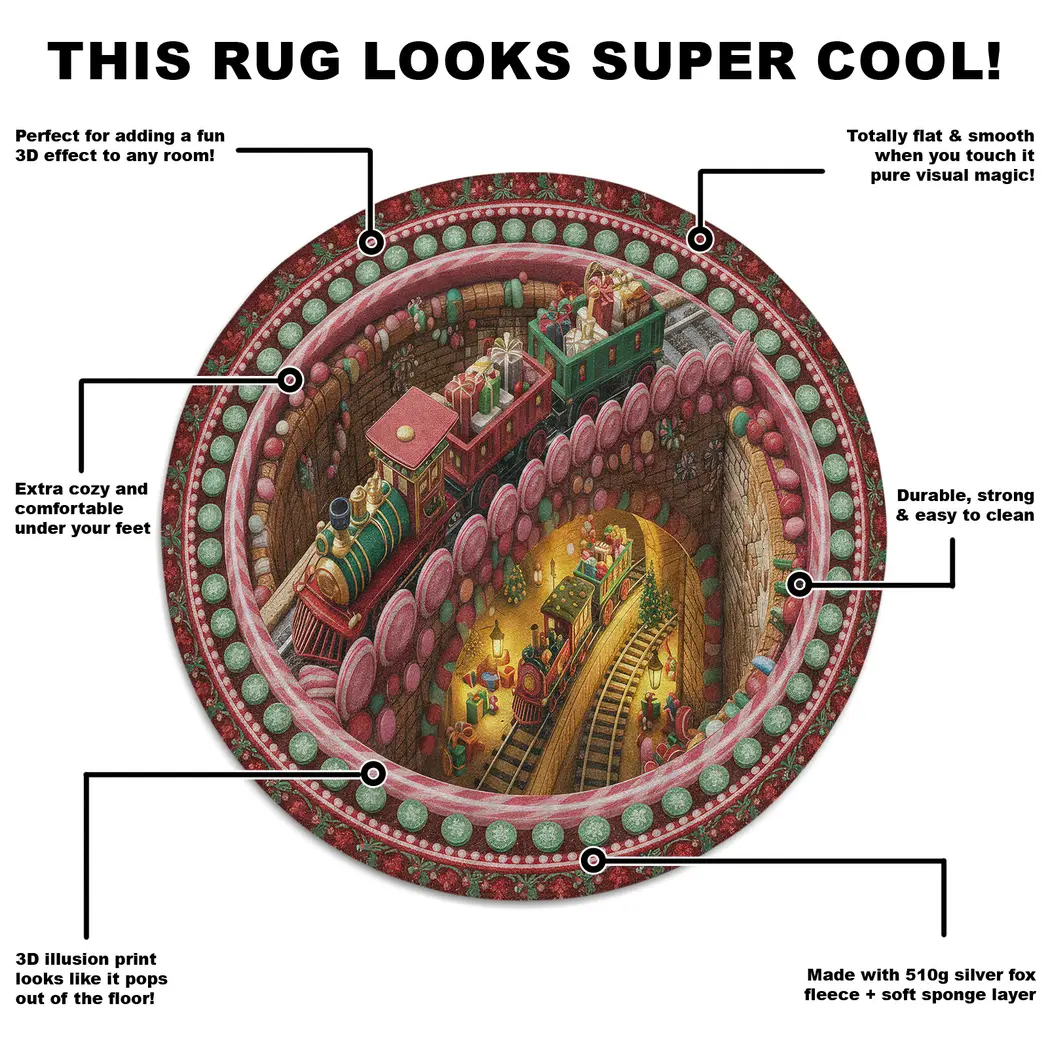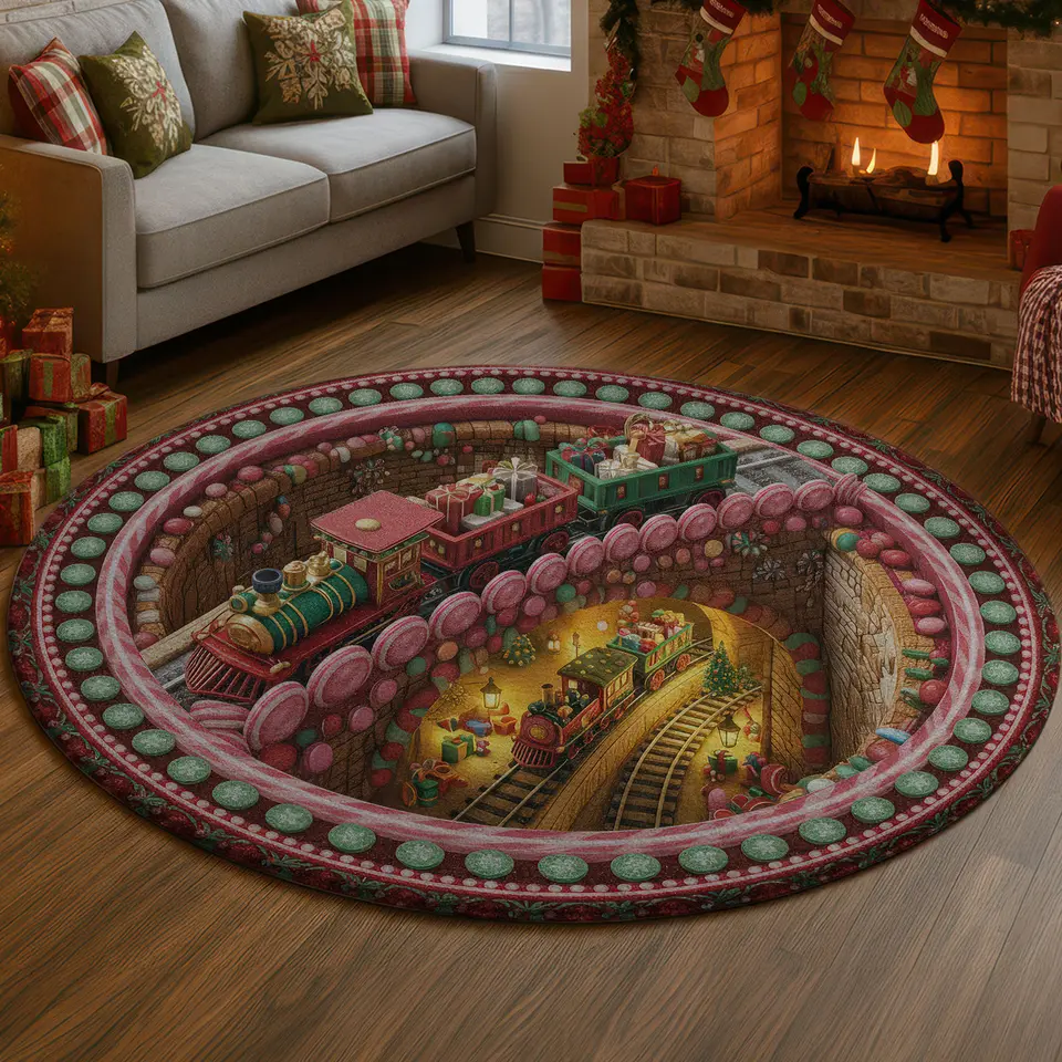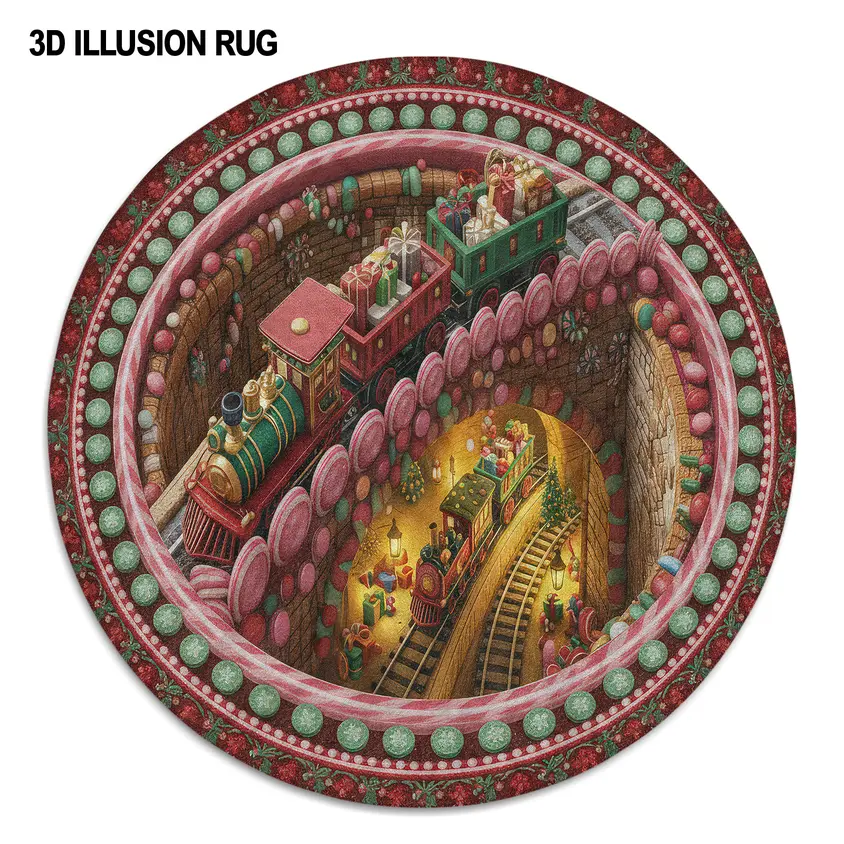 The Red Green 3D Illusion Train Rug Perfect For Holiday Decor showcases a captivating holiday design with a three-dimensional train winding through a colorful tunnel. This rug combines festive red and green hues, creating a cozy and magical centerpiece to enhance any holiday setting.