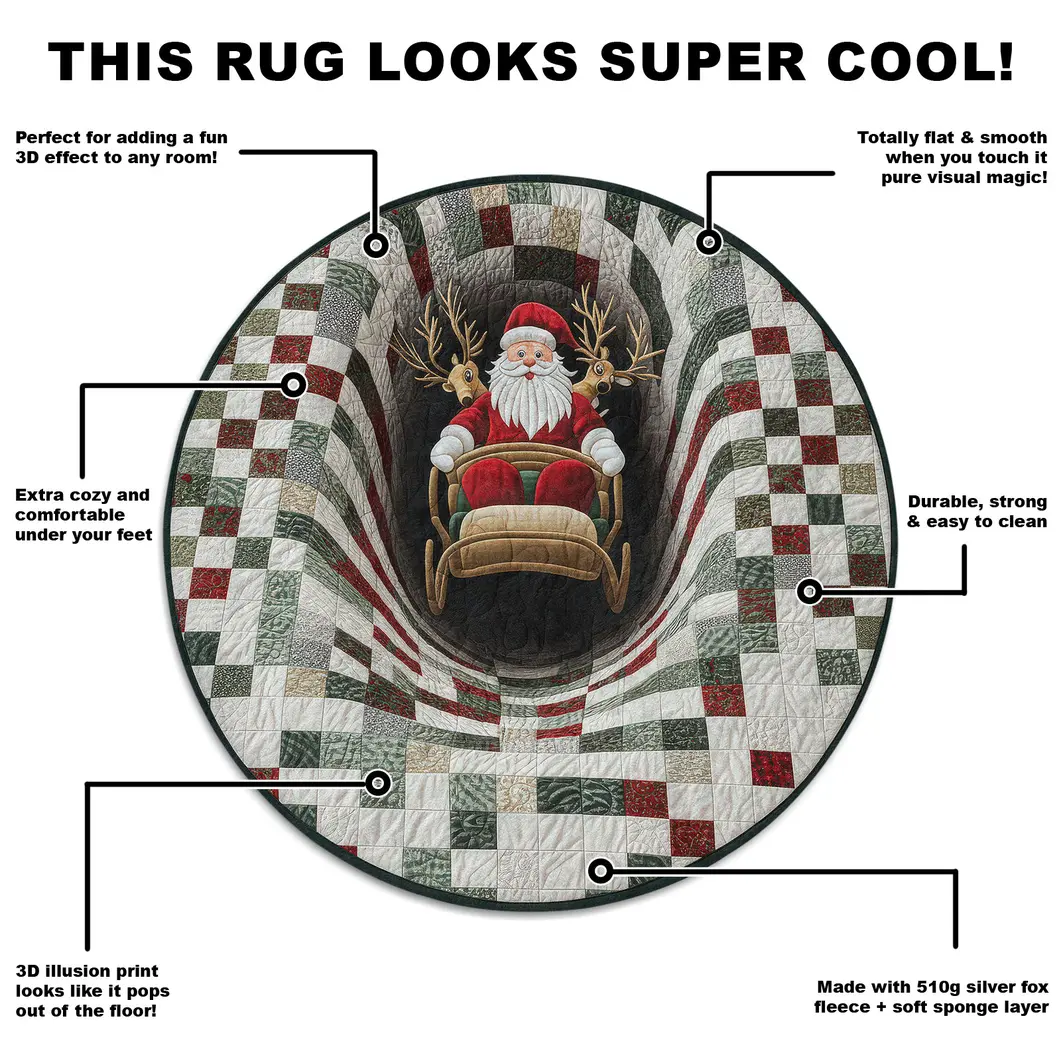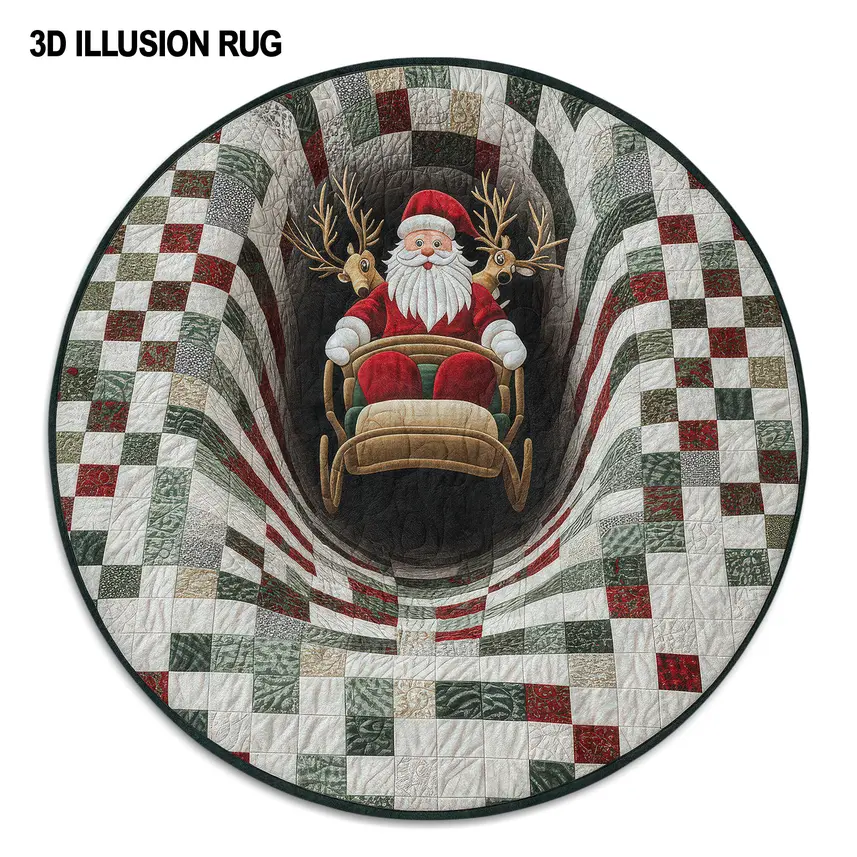 The Red White 3D Santa Illusion Rug – Festive Holiday Floor Decor captures the spirit of the season with its mesmerizing three-dimensional design. Featuring a charming Santa riding his sleigh, framed by a harmonious checkered pattern, this round rug brings warmth and festive cheer to any holiday setting.