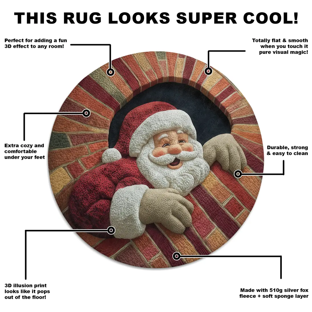 The Red White 3D Santa Illusion Rug For Festive Holiday Decor features an eye-catching design that cleverly uses vibrant colors and textures to create a lifelike 3D effect. This round rug showcases Santa Claus popping out of a chimney, perfect for adding a joyful and warm holiday spirit to any room.