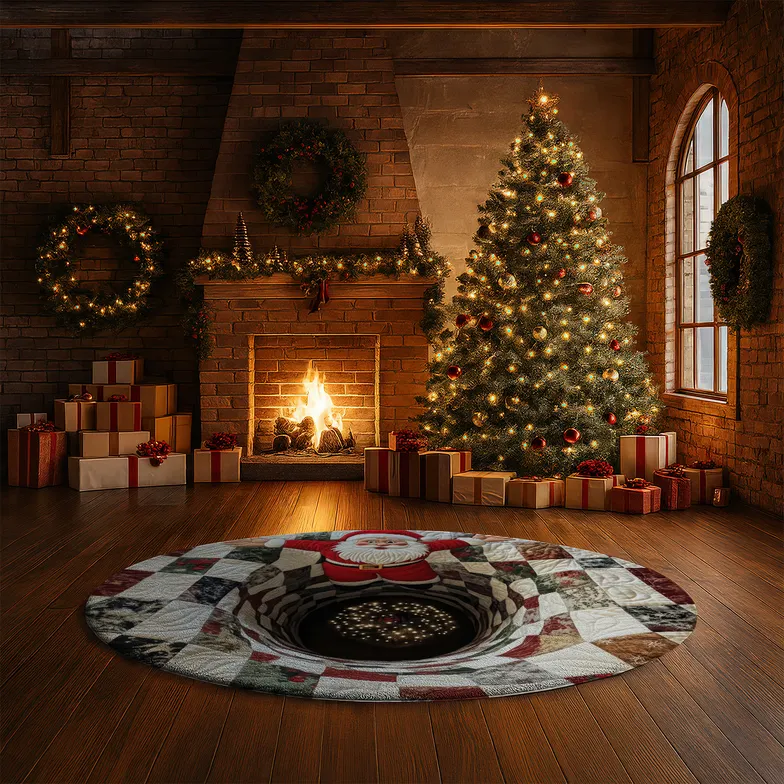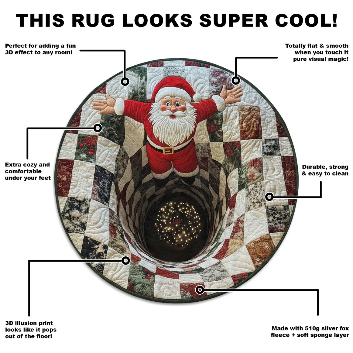 The Red White Santa 3D Illusion Rug – Festive Holiday Decor features a captivating design that brings holiday cheer to any space. This round rug combines vibrant reds, crisp whites, and deep greens, creating a visually stunning 3D effect with Santa Claus joyfully spreading his arms over a quilted, checkered pattern.