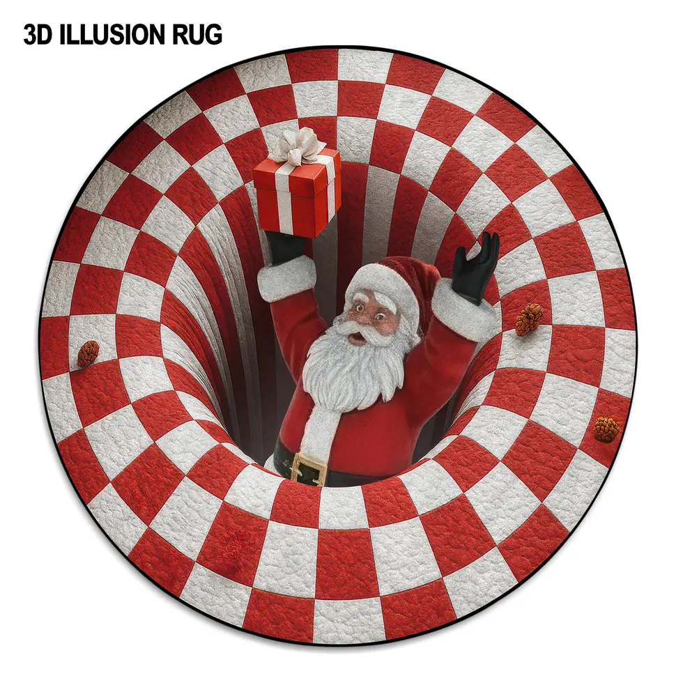 The Red White Santa 3D Illusion Rug – Perfect Holiday Decor Accent is a striking addition to your festive setting, featuring a captivating 3D effect with Santa Claus seemingly emerging from a swirling red and white checkerboard pattern. This vibrant rug blends classic holiday colors with playful design, making it an unforgettable seasonal statement piece.