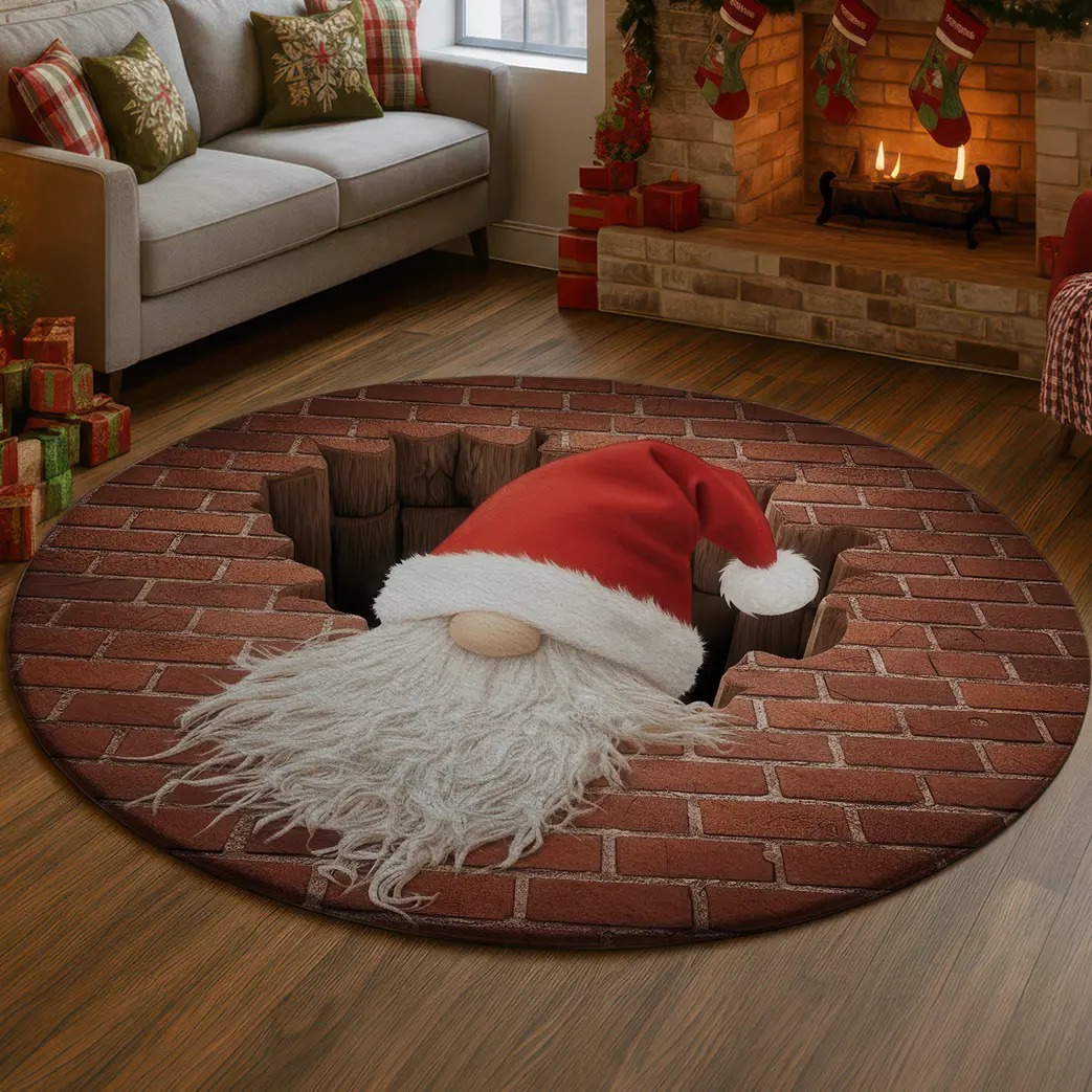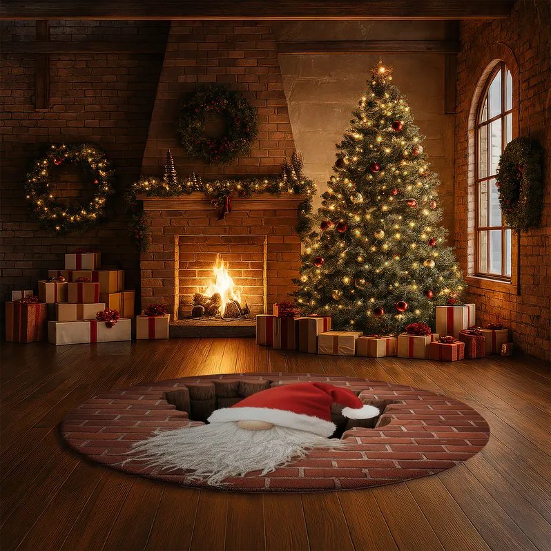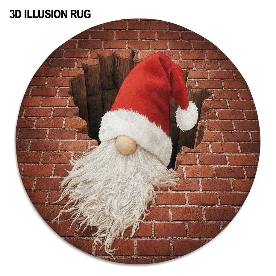 The Red White Santa 3D Illusion Rug Unique Holiday Decor Piece brings festive cheer to your home with its captivating design. Featuring a playful Santa figure seemingly emerging from a brick wall, this rug combines rich reds, crisp whites, and textured details to create a standout holiday decoration that adds warmth and whimsy to any space.