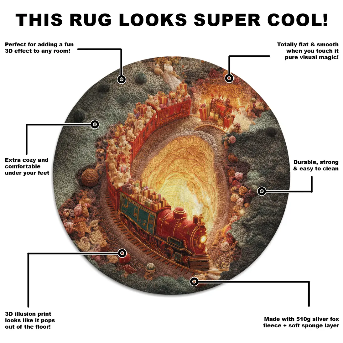 • 3D Train Illusion Design: The dynamic, swirling train motif gives the illusion of movement, making it a captivating centerpiece that delights children and adults alike. This unique pattern encourages creativity and storytelling during playtime.